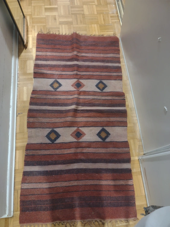 Selling a woven area rug with a striped pattern. It features a mix of brown, beige, and black stripes, with diamond accents. It's in good condition and would be a cozy addition to any room