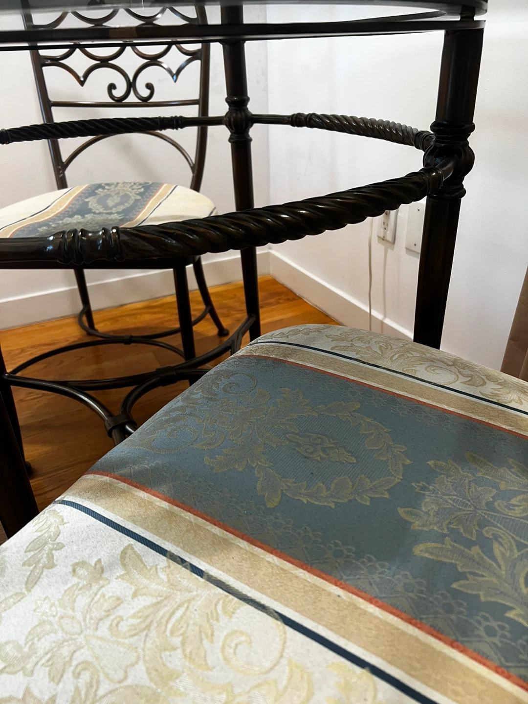 This piece is in great condition. The ironwork and chair fabric was refinished and reupholstered, respectively.
