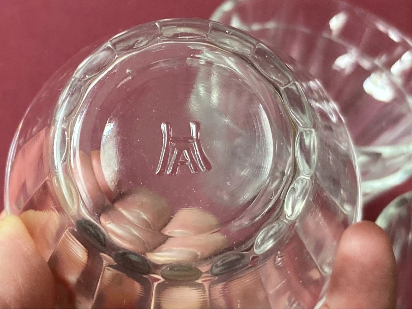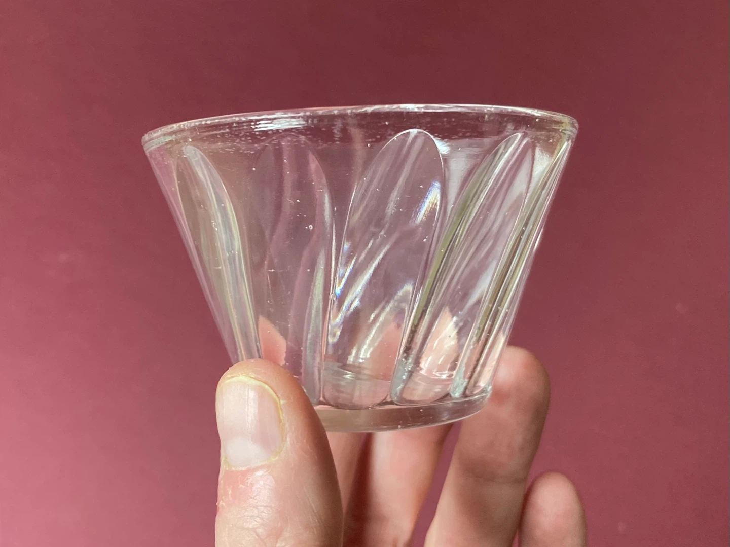 Charming set of 7 vintage glass condiment or dessert cups. They are depression era by Hazel Atlas, all marked on the bottom. They feature a tapered design with ridges along the sides which are smooth on the outside and textured on the inside. They are not all identical, some have more ridges than others, and one of them has angled ridges.