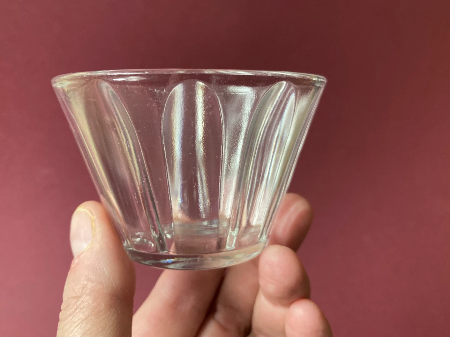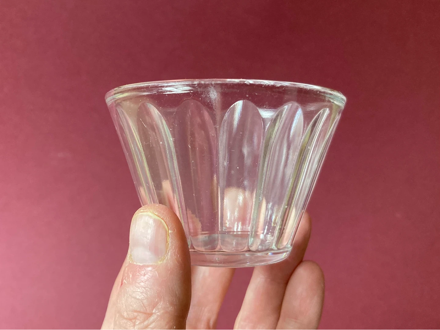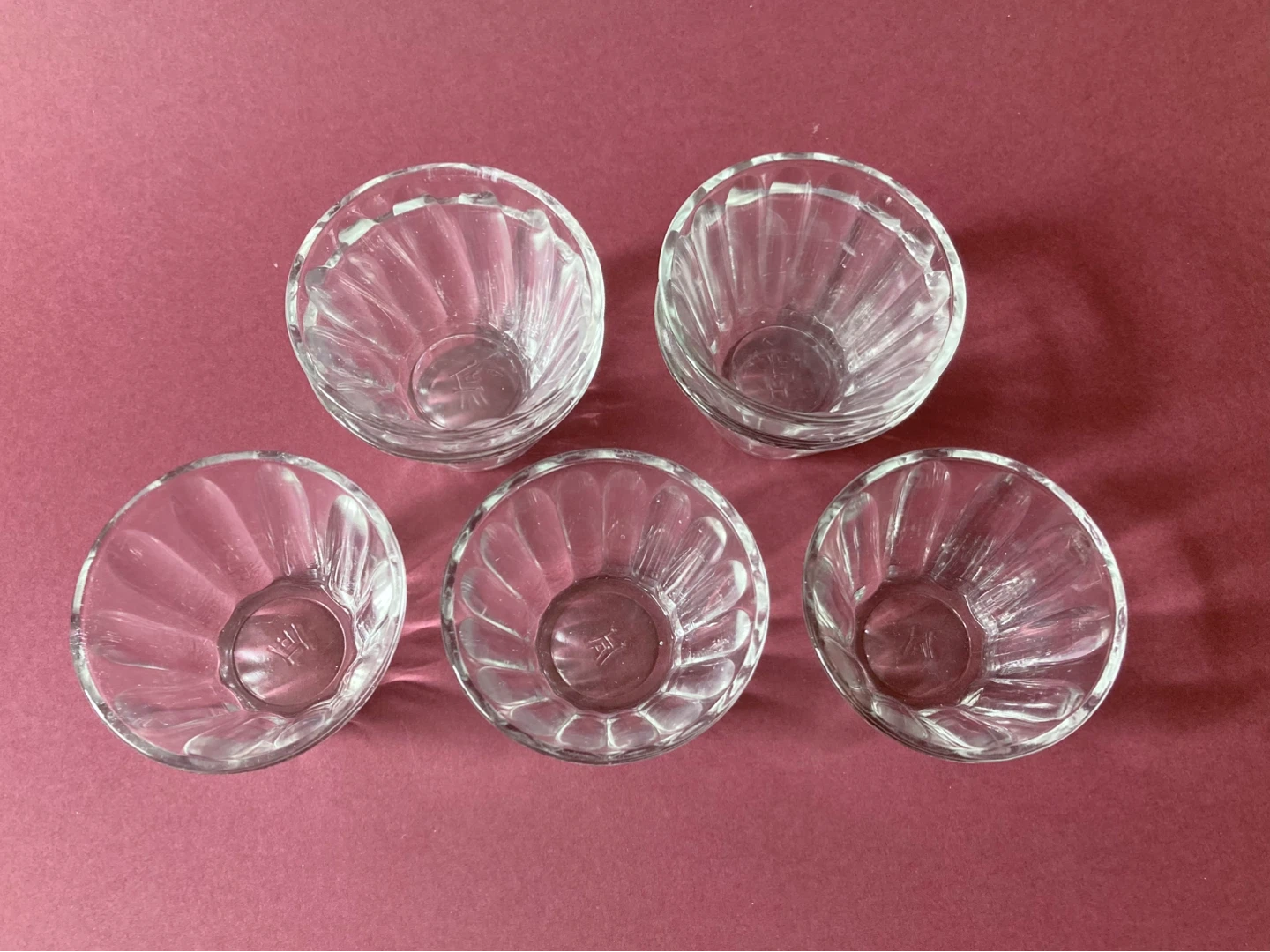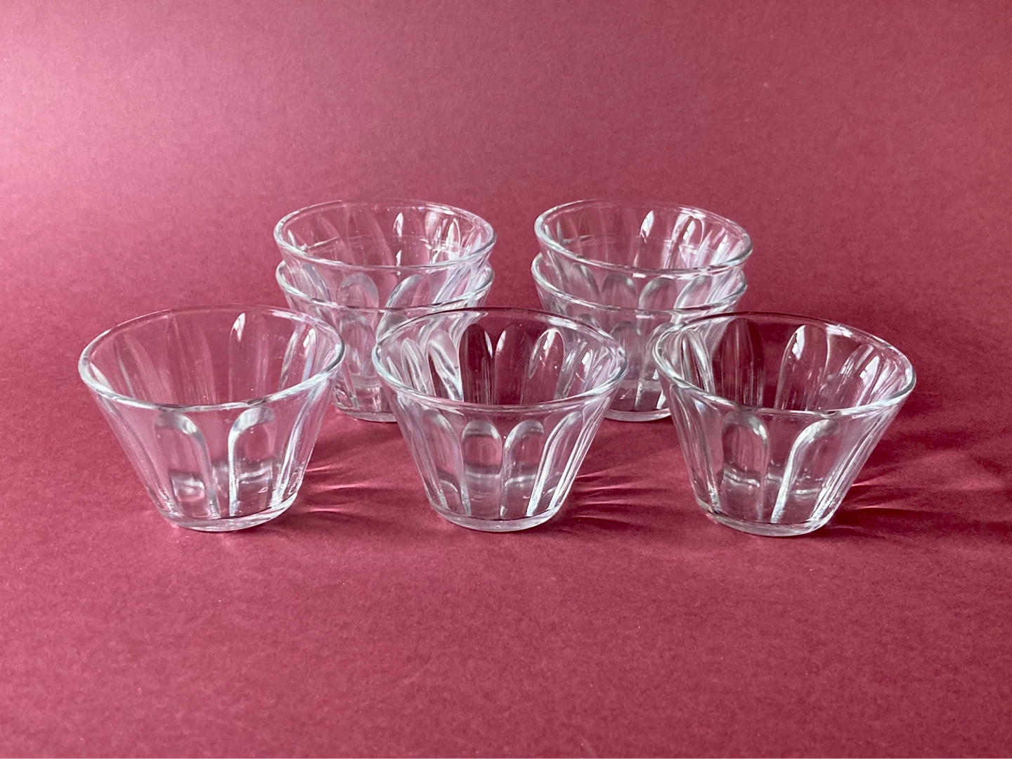 Charming set of 7 vintage glass condiment or dessert cups. They are depression era by Hazel Atlas, all marked on the bottom. They feature a tapered design with ridges along the sides which are smooth on the outside and textured on the inside. They are not all identical, some have more ridges than others, and one of them has angled ridges.