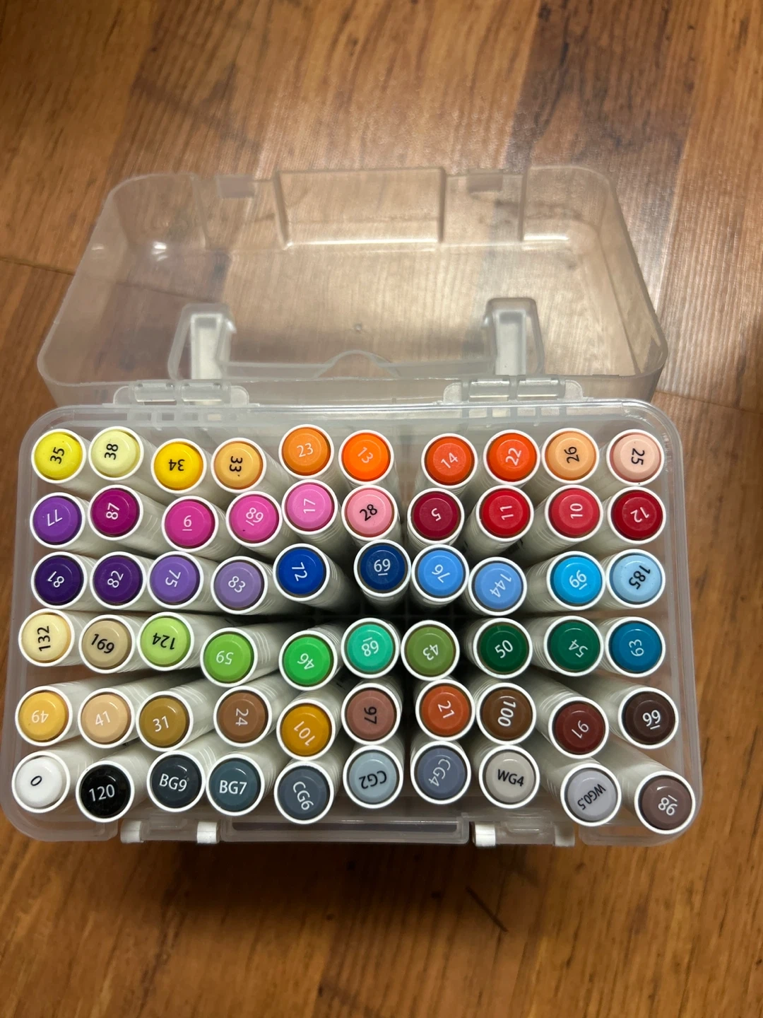 Set of 60 dual tip marker pens by Ohuhu. Features water-based, vibrant colours suitable for drawing, calligraphy, and more. Includes a portable plastic case for storage.
