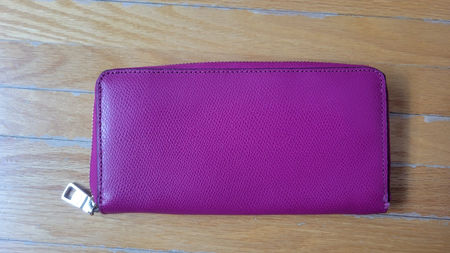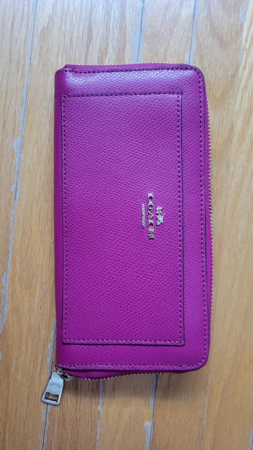 It's a stylish pink zip-around wallet from Coach. The interior features multiple card slots and compartments for organization. Made from durable leather. Brand new, never been used.