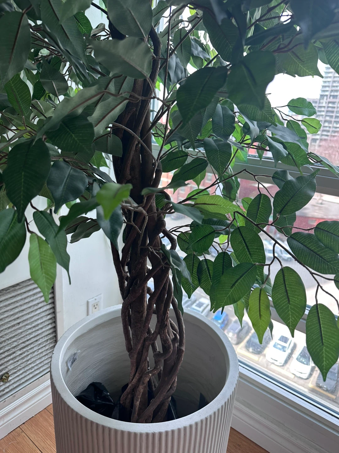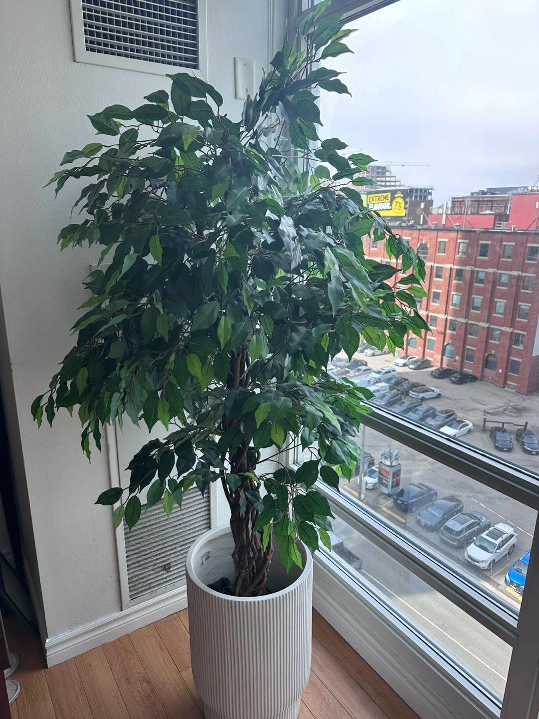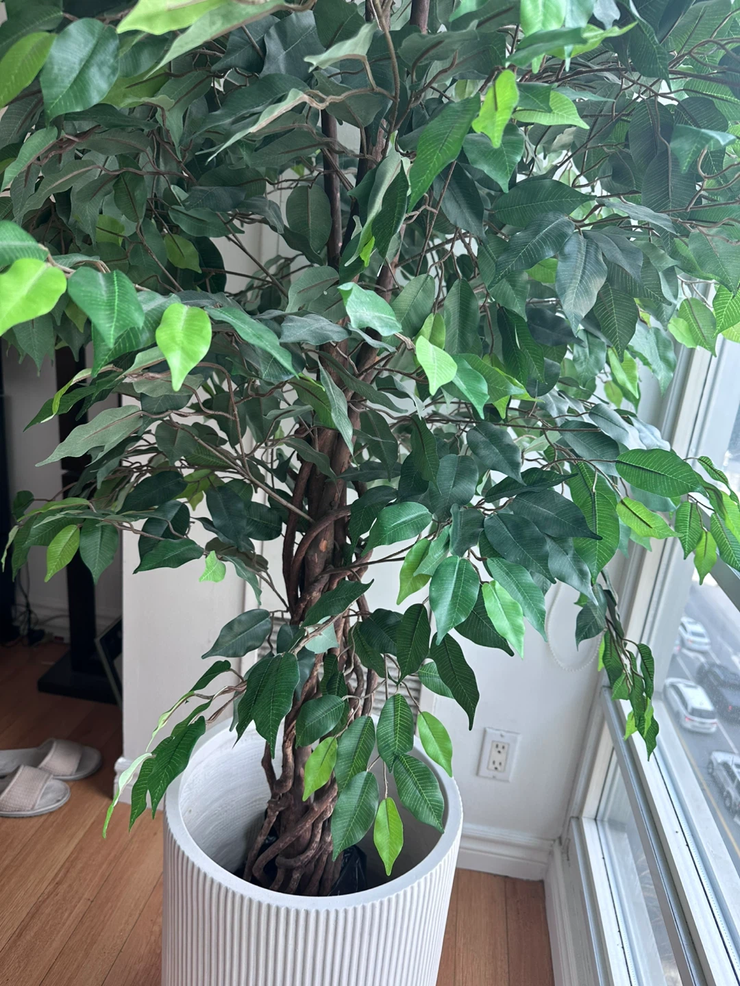 A faux ficus tree with a braided trunk, comes in a fluted white planter. Great for adding a touch of greenery to any room without the maintenance! Pot not included