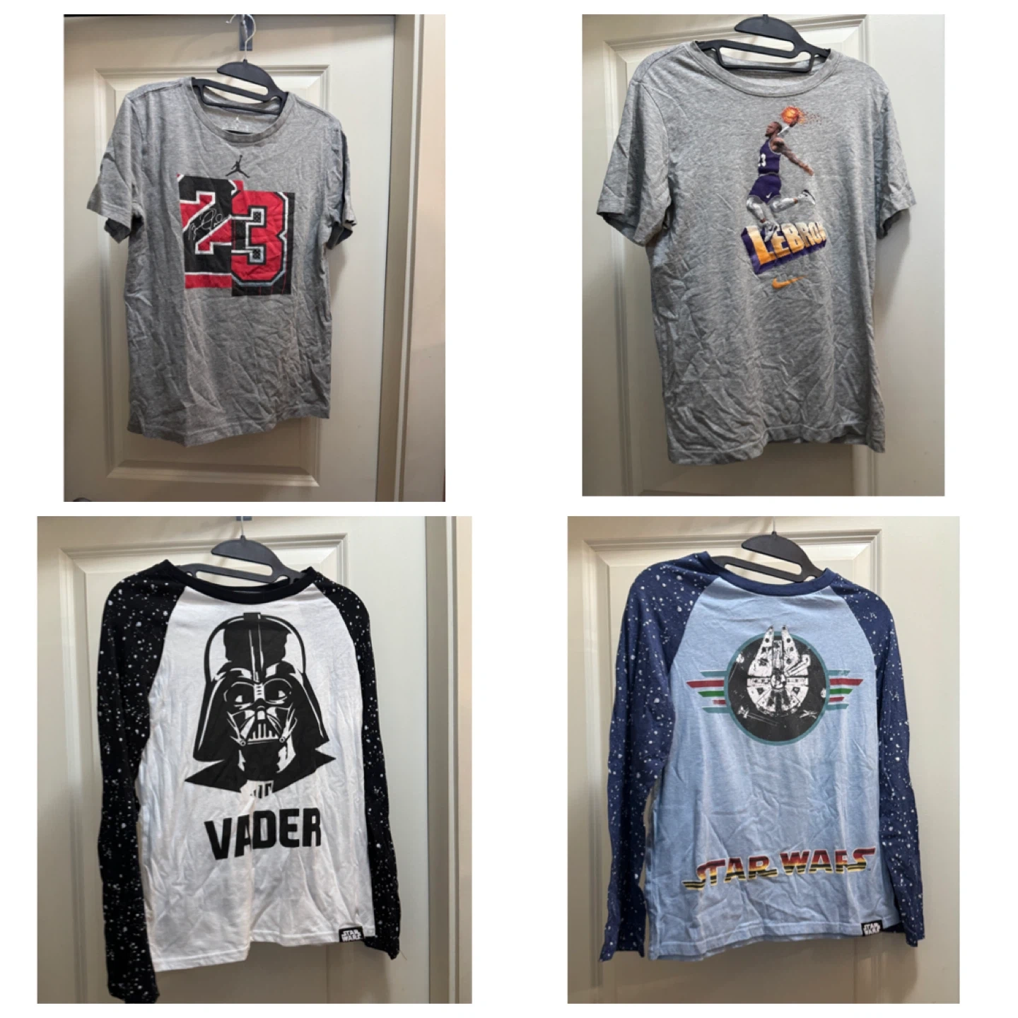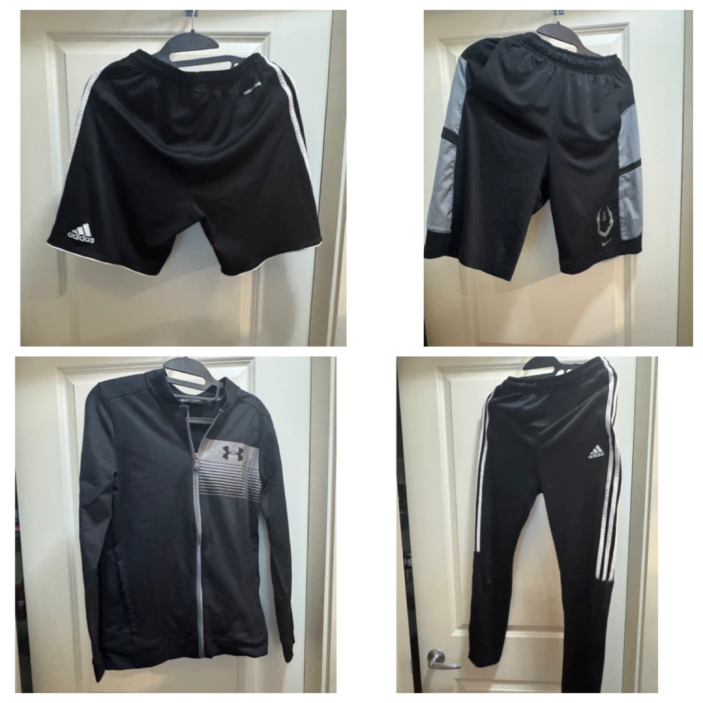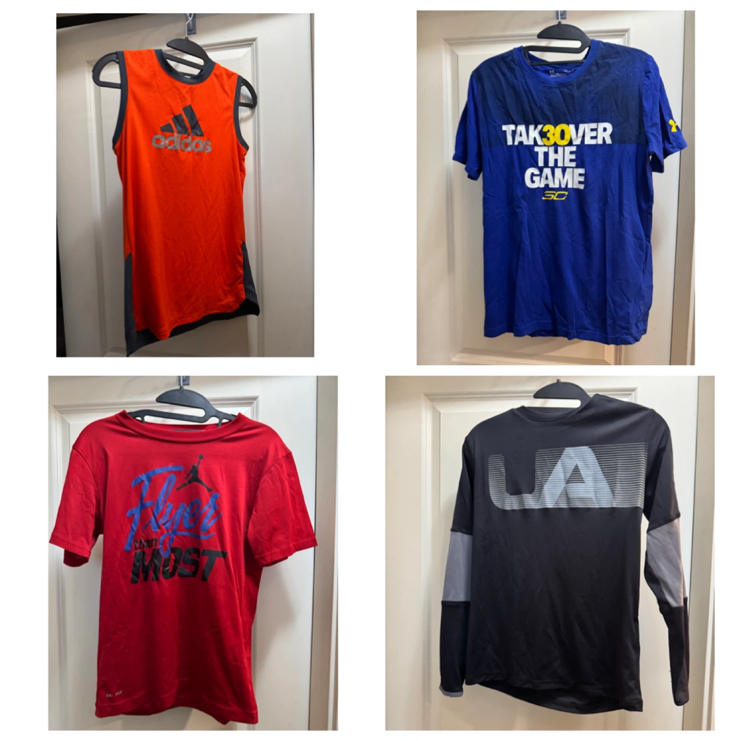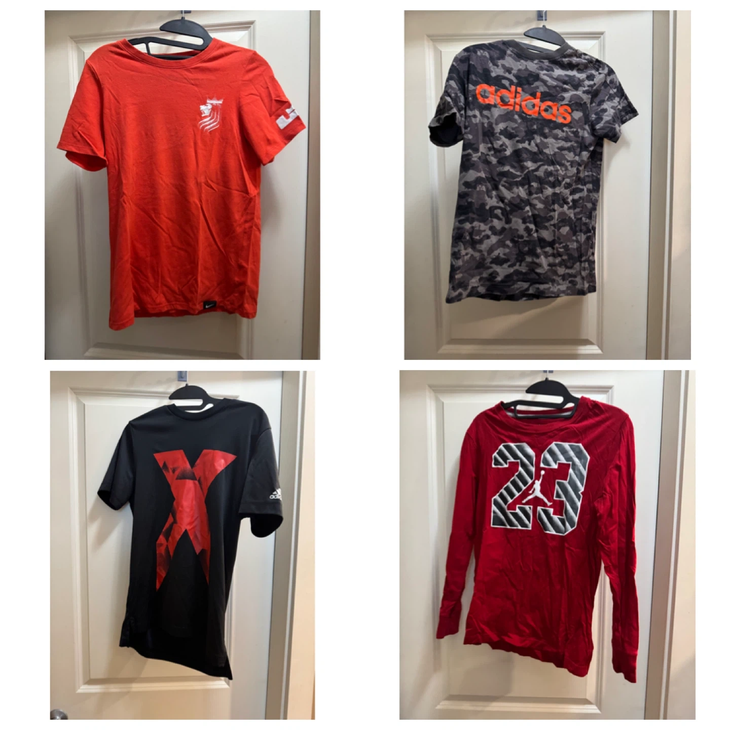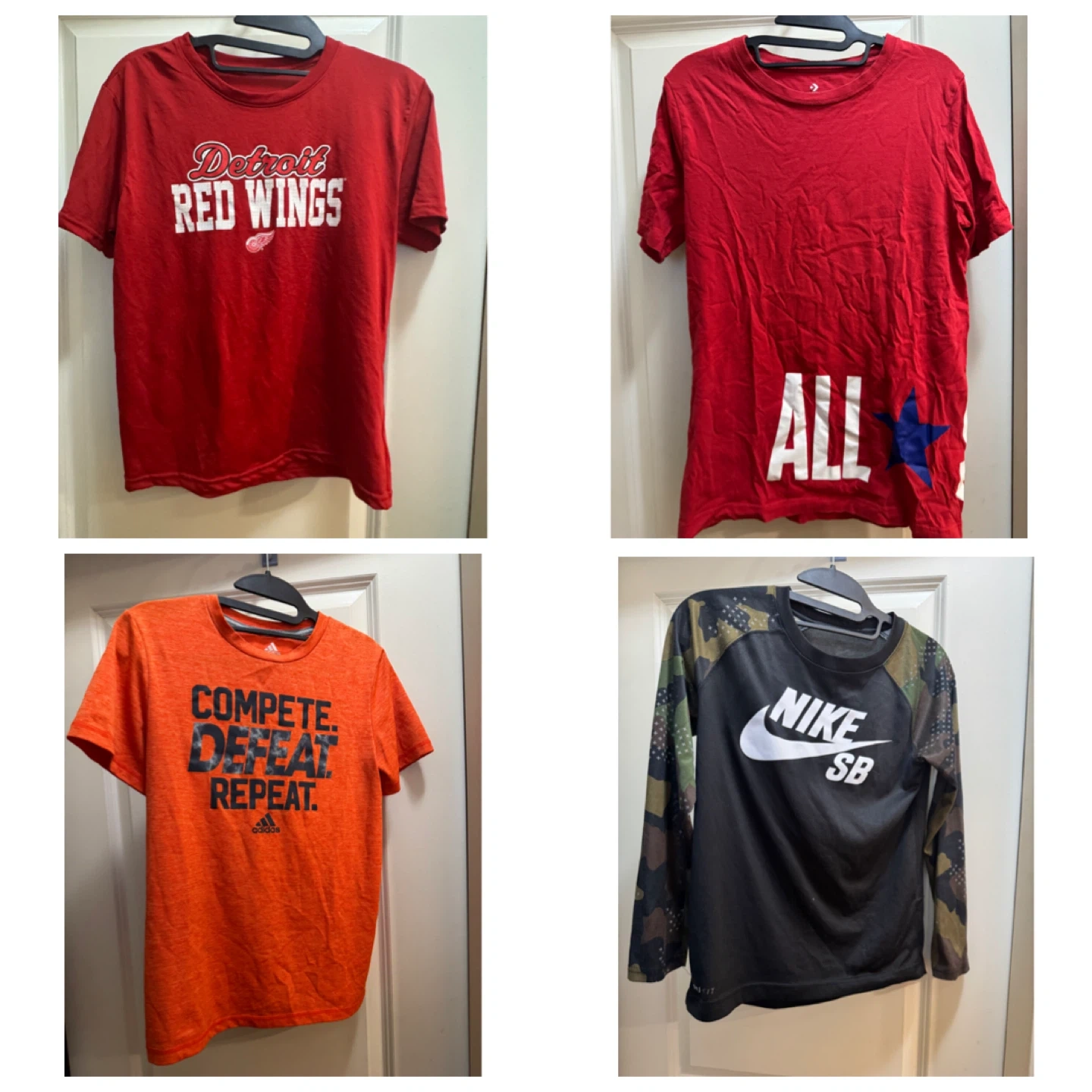 A collection of mixed brand clothing items including t-shirts from Detroit Red Wings, Converse, Adidas, and Nike SB. Also included are shorts from Adidas and Nike, a jacket from Under Armour, and Adidas track pants. Variety of styles and designs!