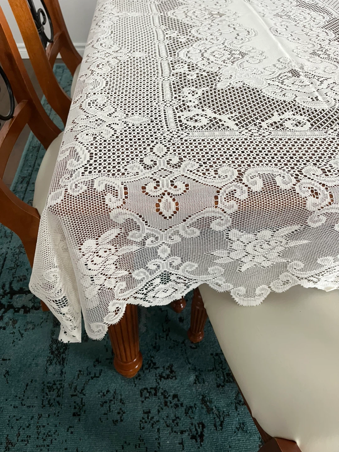 A beautiful ivory lace tablecloth designed to add elegance to your dining space. It features intricate floral patterns and a scalloped edge. Its polyester material is durable and easy to care for. Perfect for special occasions or everyday use!