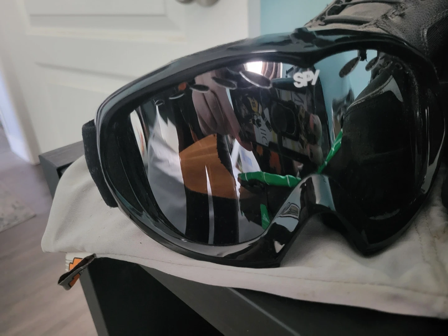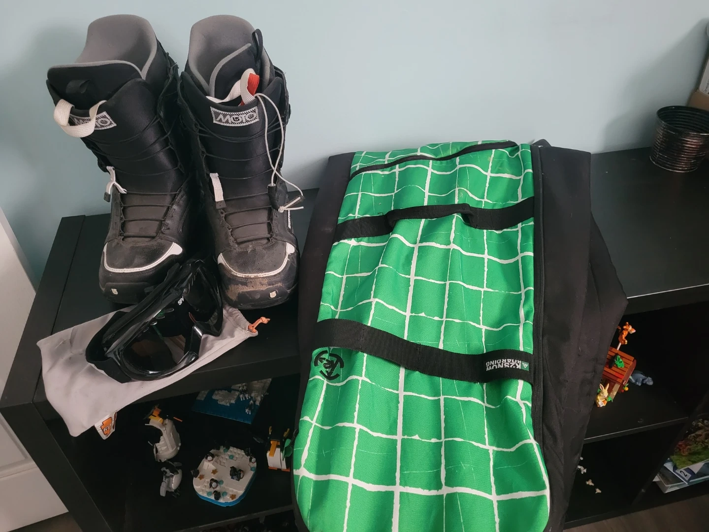 Burton snowboard boots (size 8). Spy goggles. K2 Green snowboard bag. Great for hitting the slopes! Boots are black with white accents. Goggles have a reflective lens. 🏂