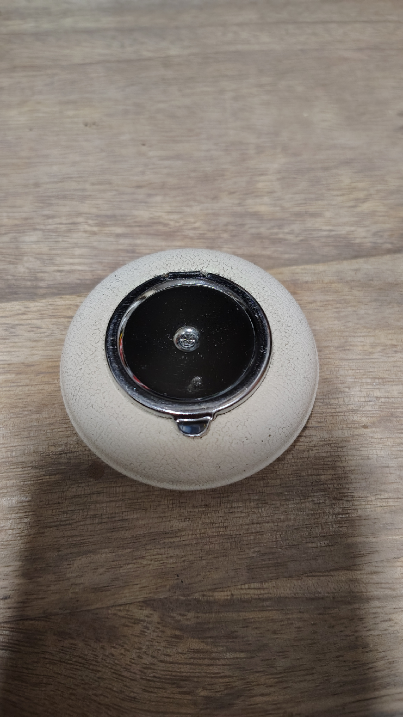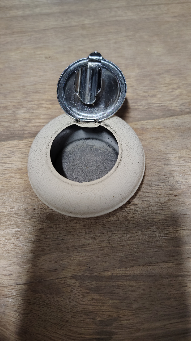 Selling a vintage round ashtray. It has a unique design with a lid. It's in good condition for its age!