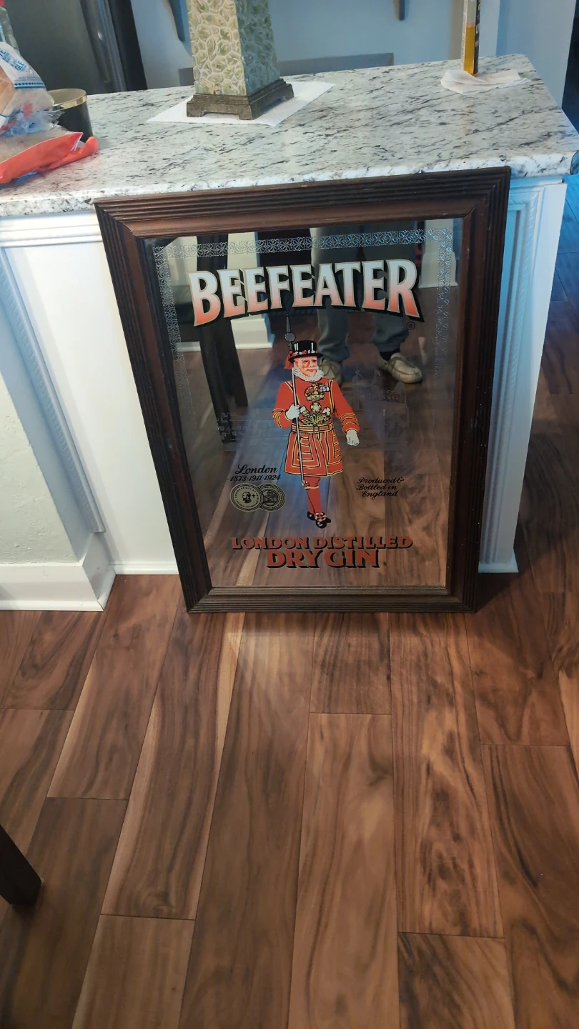 Classic Beefeater mirror featuring the iconic Beefeater illustration and "London Distilled Dry Gin" text. Wooden frame. Measures approx. 26 X 35/6/8.