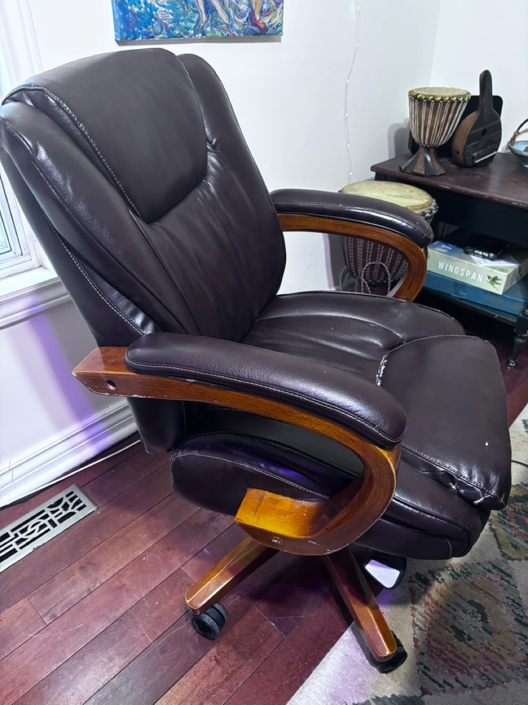 This executive office chair is upholstered in dark brown faux leather with wood accents. It offers a comfortable seating experience for long work sessions. The chair's rolling base allows for easy mobility around your workspace.