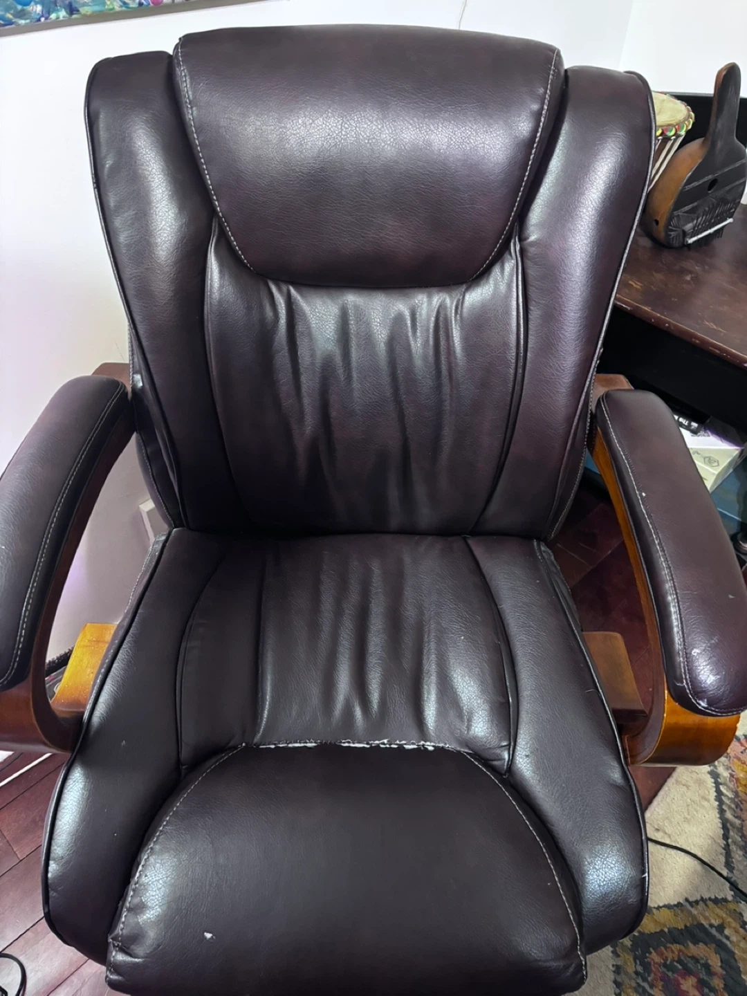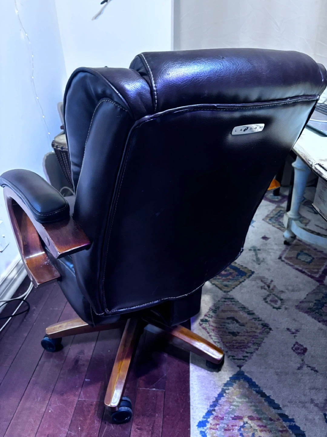This executive office chair is upholstered in dark brown faux leather with wood accents. It offers a comfortable seating experience for long work sessions. The chair's rolling base allows for easy mobility around your workspace.