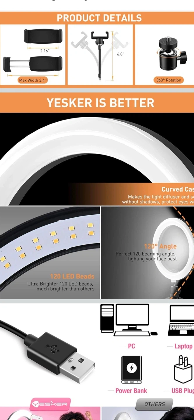 Yesker 10” ring light with a tripod stand. It features a curved casing and 120 LED beads for brighter lighting.