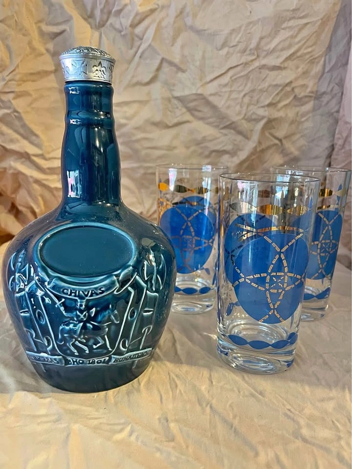 Chivas Regal decanter (dated 60's-80's) with 3 vintage high ball glasses (dated 40's-50's). No chips or cracks. Pick up in Dundas.