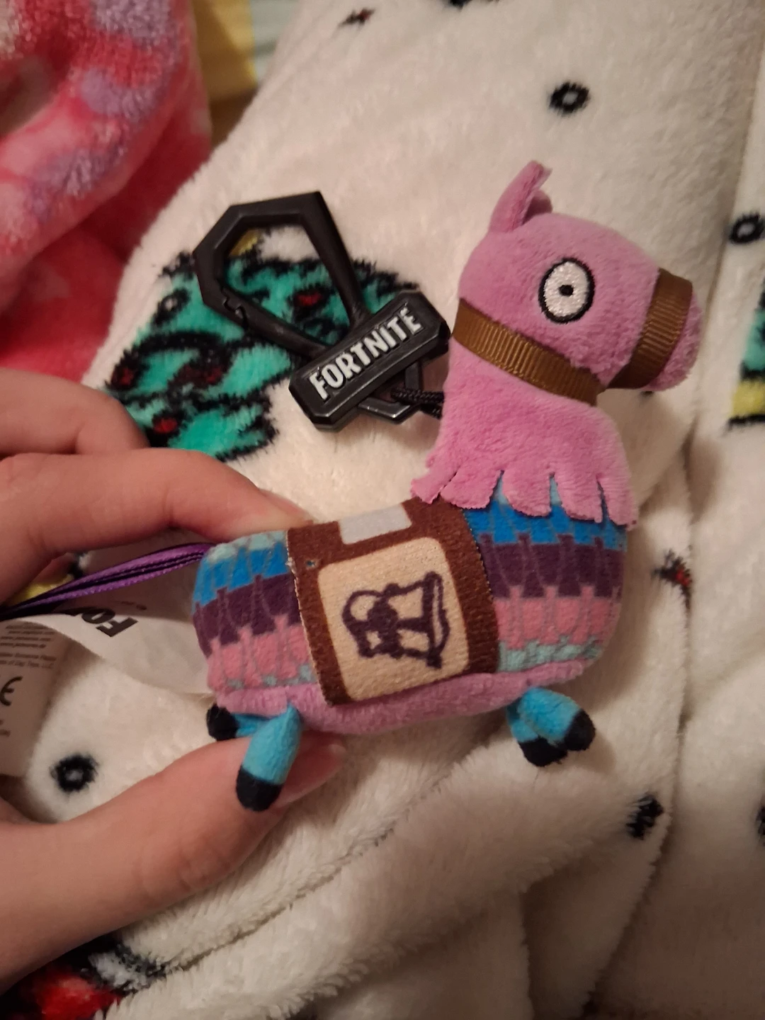 This is a plush Fortnite Llama keychain. It features a clip for easy attachment. The Llama is pink with colourful patterned saddlebags.
