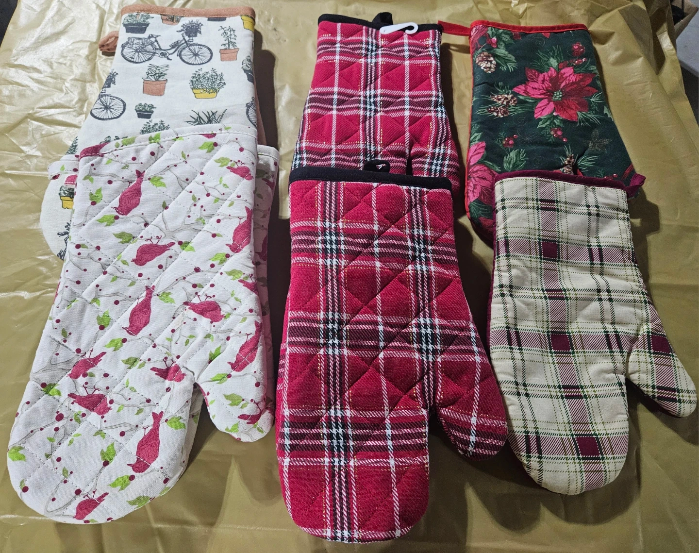 9 quilted oven mitts with various festive designs. Includes two red plaid, one with a bicycle and plant pattern, and one with a poinsettia floral print. These are standard size oven mitts.