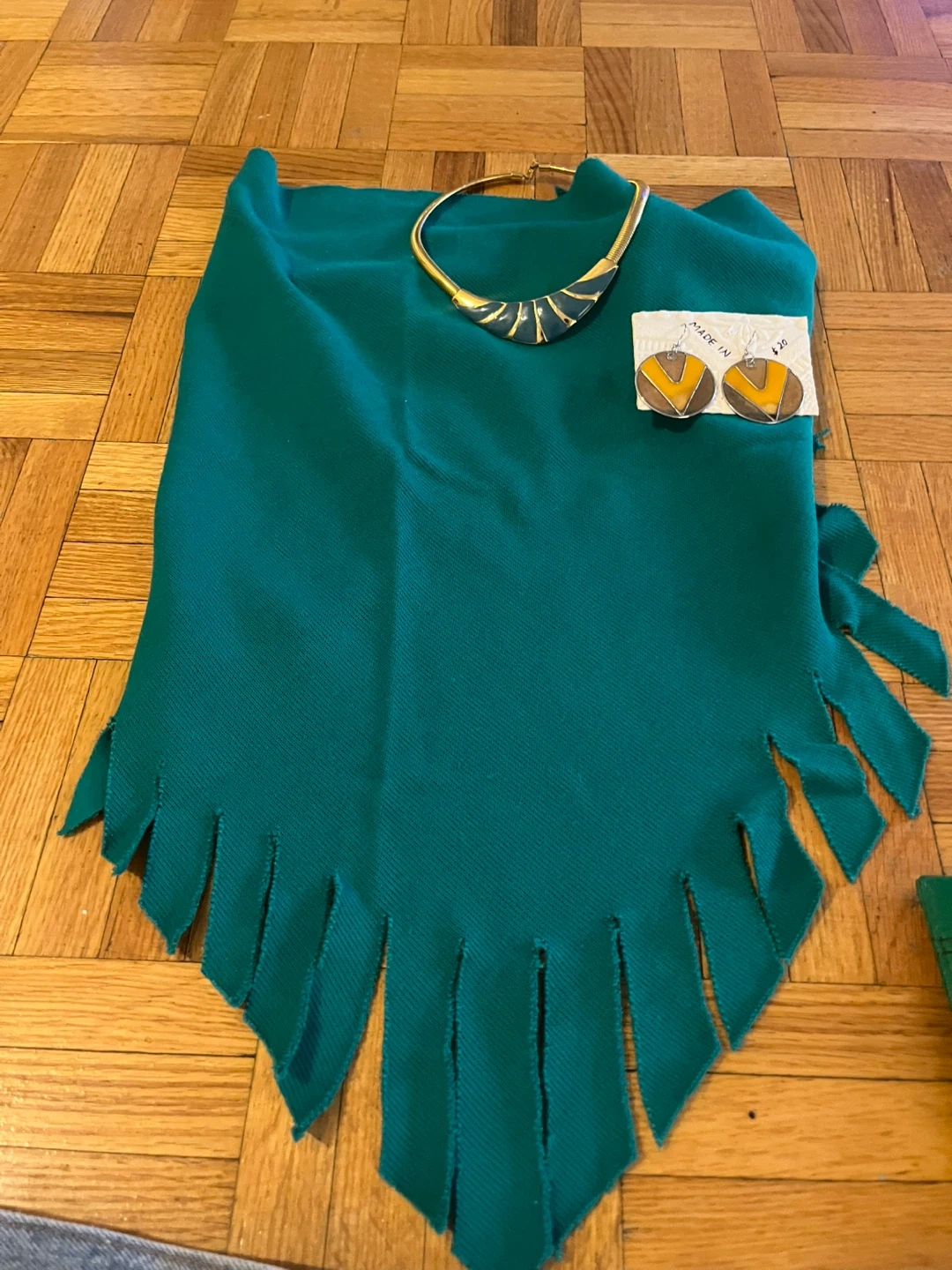 Blue denim shorts with a frayed hem. Teal poncho with fringe detail. Includes gold-tone necklace, earrings, and green clutch.