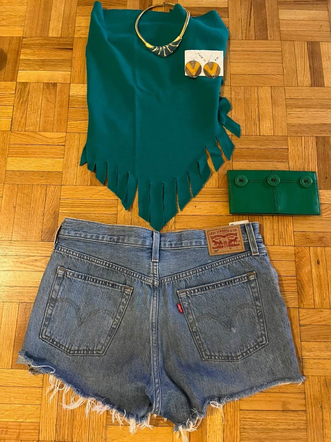 Freestyle outfit, five piece set perfect for summer. The Levi’s are 501 size 10. The halter top can be worn as a scarf or a tide as a halter with a fringe .