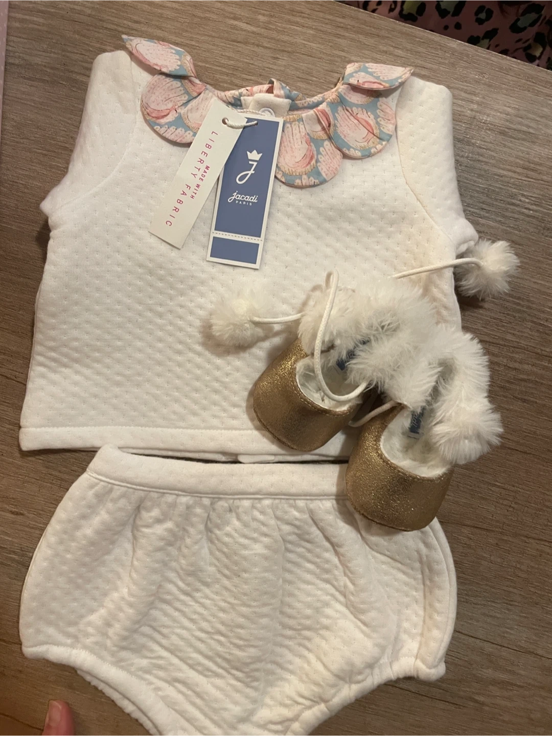 A cute baby outfit from Jacadi Paris! This set includes a top, bloomers, and a pair of adorable gold shoes with fluffy detailing. The top features a unique floral collar. Perfect for your little one!