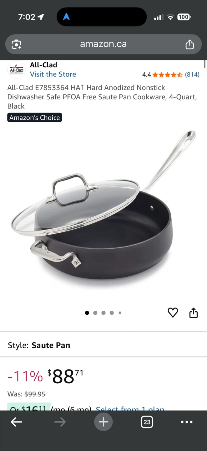 This is an All-Clad HA1 hard anodized nonstick sauté pan. It's 4-quart capacity and comes in black. The pan is dishwasher safe and PFOA-free.