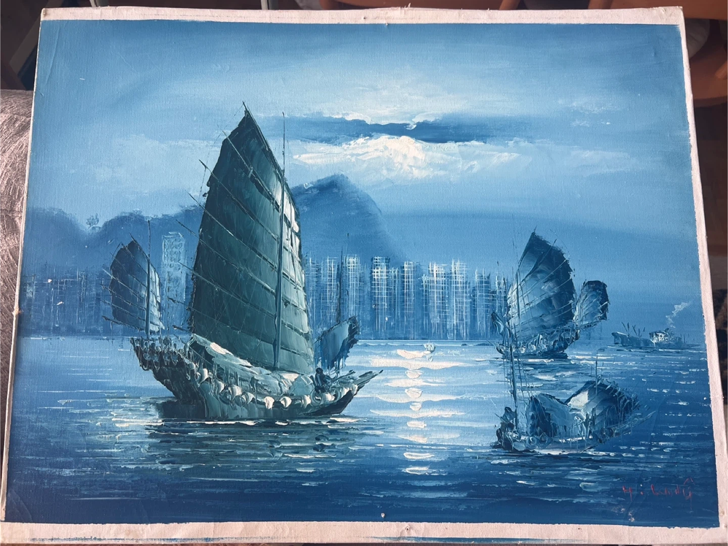 This is a vintage oil painting depicting sailboats on the water. The artwork features a serene blue seascape with traditional sailing vessels. It's signed by the artist in the lower right corner.