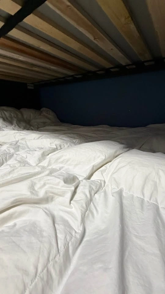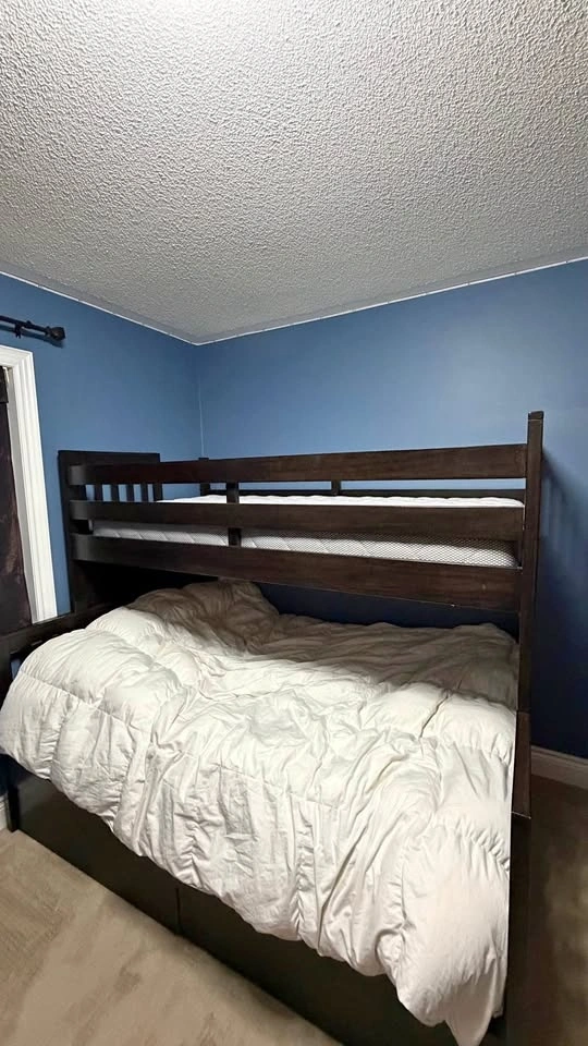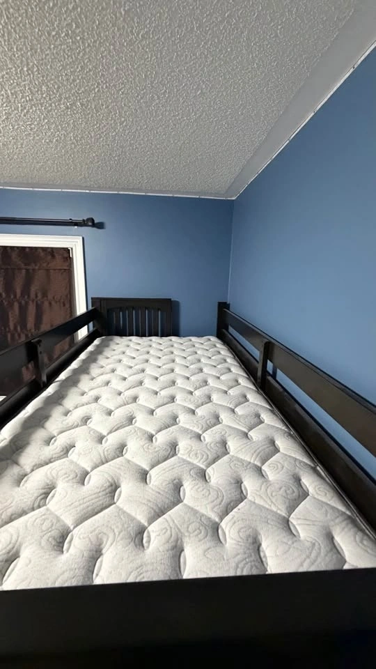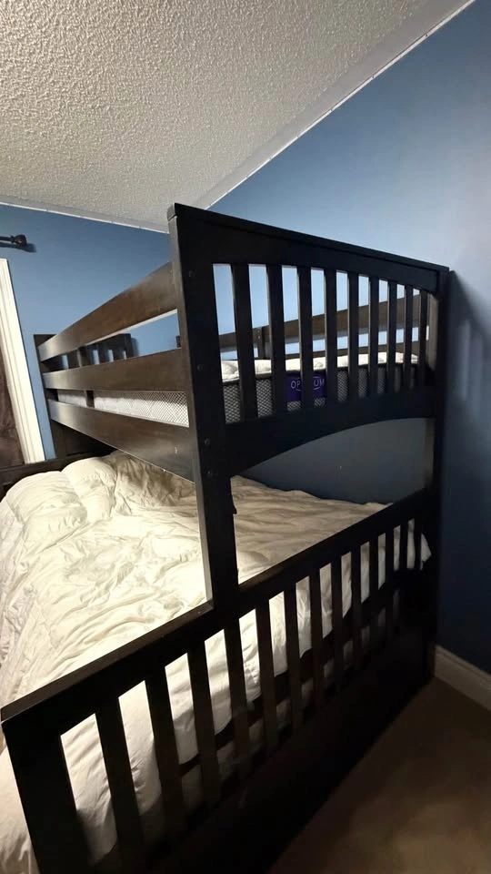 No damage, no squeaks, just switching up the room. Bottom mattress is a double (not included), top is a twin — I can throw in the top twin mattress for +$75 if you want it.