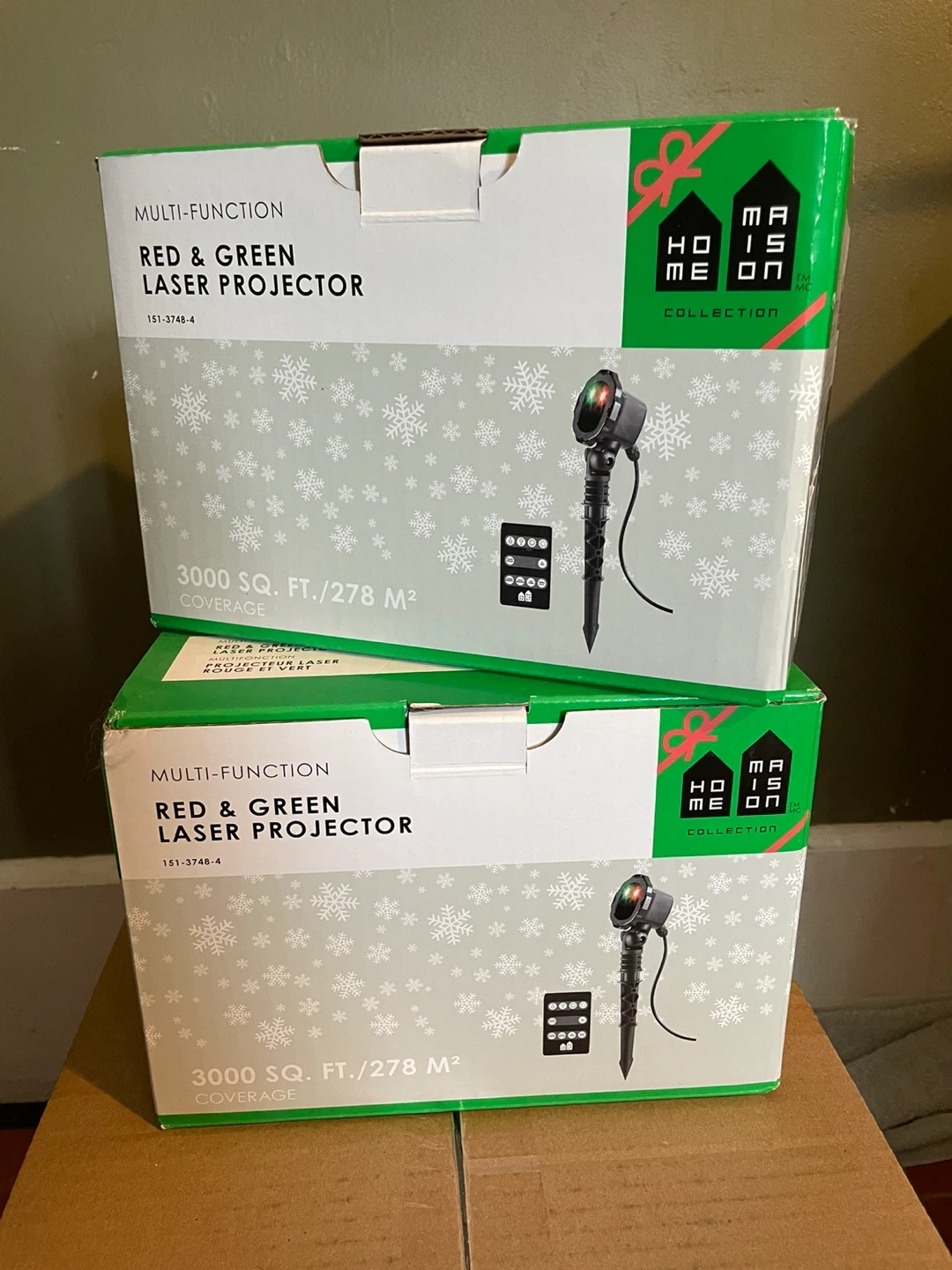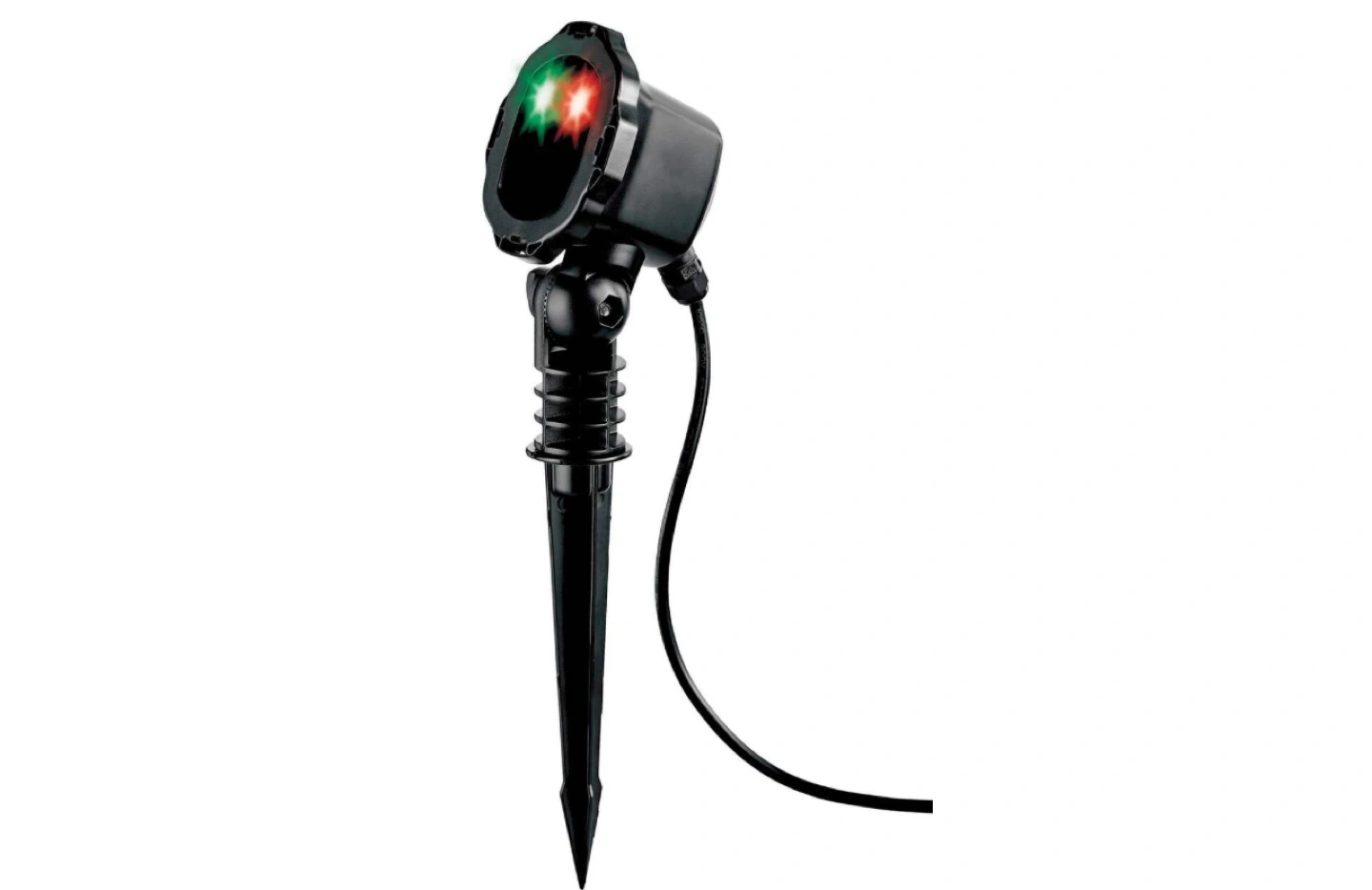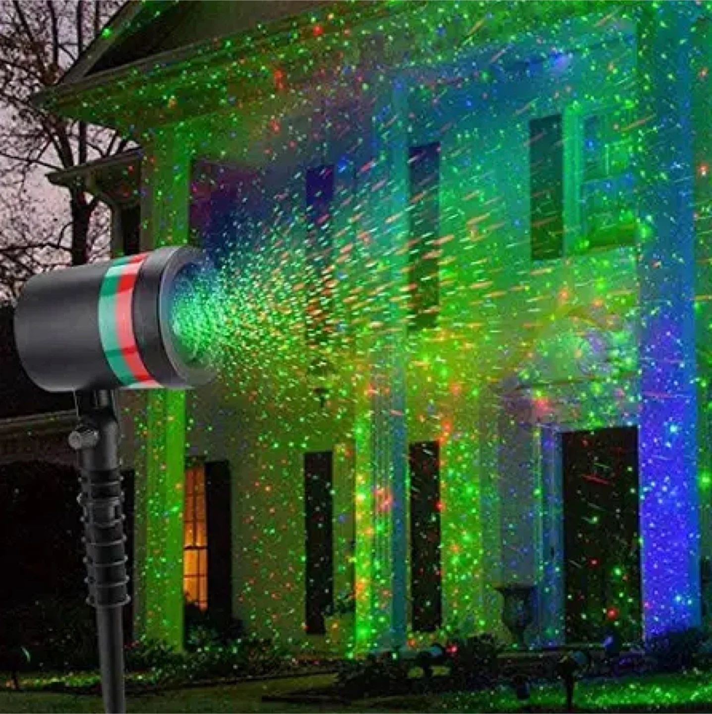 This multi-function laser projector displays red and green lights. It covers 3000 sq. ft. or 278 m². This unit is great for outdoor holiday decorations!