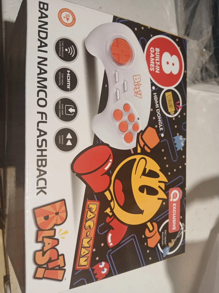 Get ready for retro gaming fun with the Bandai Namco Flashback Blast!, featuring 8 built-in classic games and a wireless controller for easy setup on any TV with HDMI. This exclusive Pac-Man edition offers hours of nostalgic entertainment right out of the box. Specifications: * 8 Built-in Games: Includes Dig Dug, Galaga, Galaxian, Mappy, Pac-Man, Sky Kid, The Tower of Druaga, and Xevious. * Wireless HDMI Dongle: Connects directly to your TV for wireless gameplay. * Wireless Controller: Provides comfortable and responsive control. * Exclusive Pac-Man Design: Features unique Pac-Man branding and design. Looking to relive those classic arcade moments? This Bandai Namco Flashback Blast! is brand new, still in its box, ready to bring back the good old days. Don't miss out—if the ad is up, it's available!