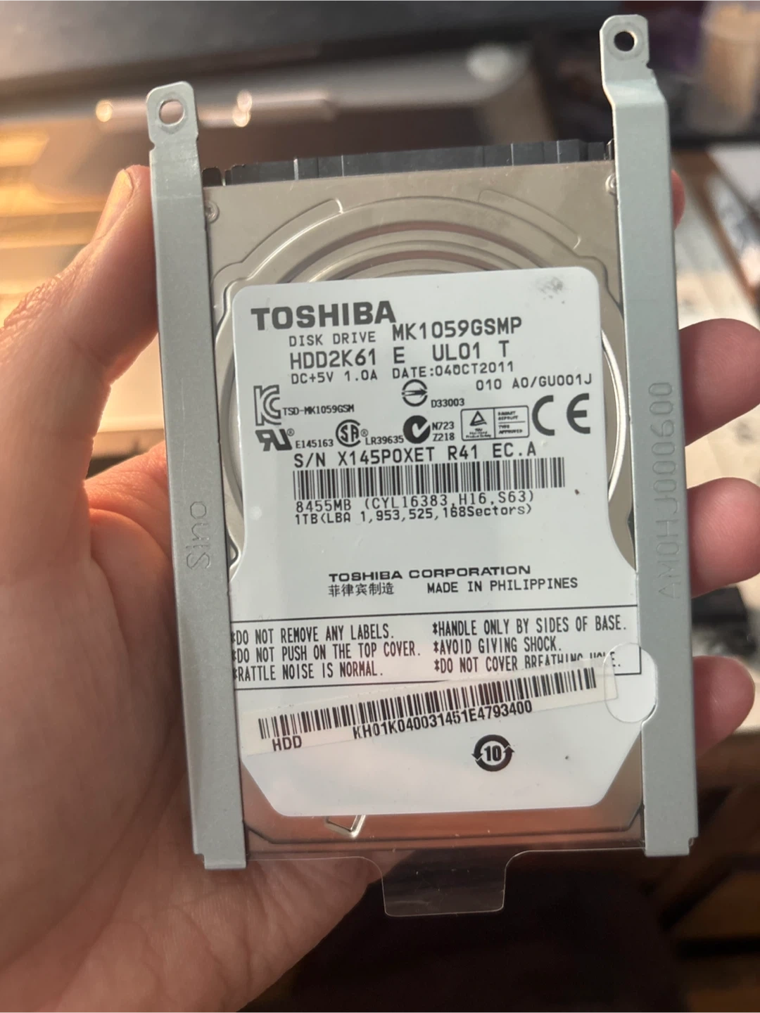 Toshiba 1TB internal hard drive, model MK1059GSMP. It's a 2.5-inch drive with a SATA interface and a manufacturing date of October 4, 2011. Made in the Philippines.