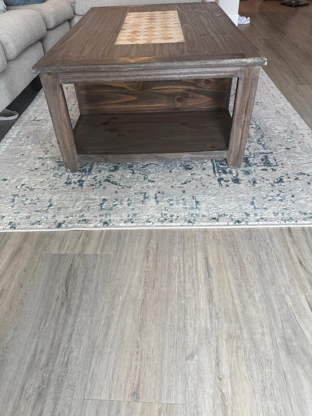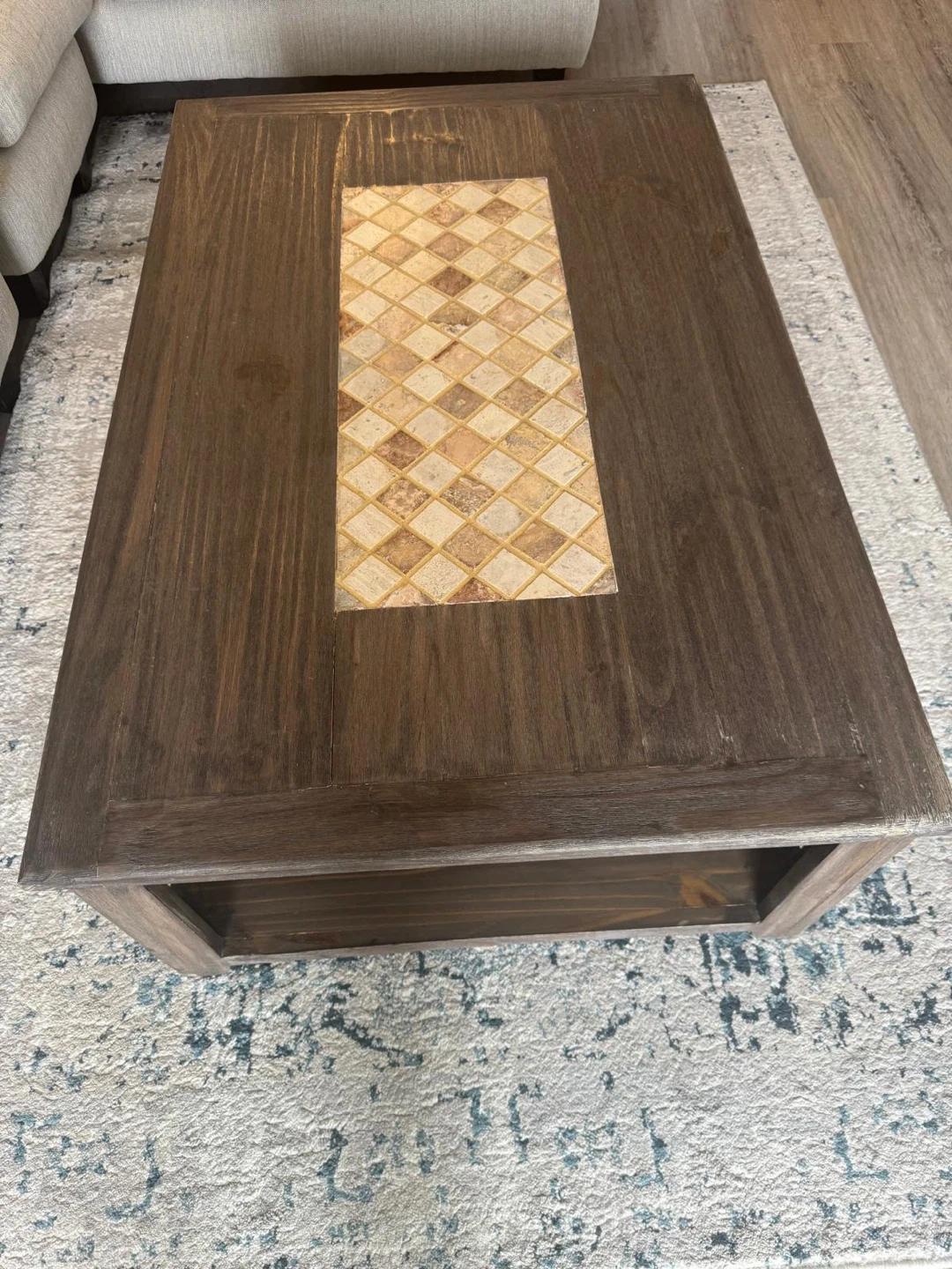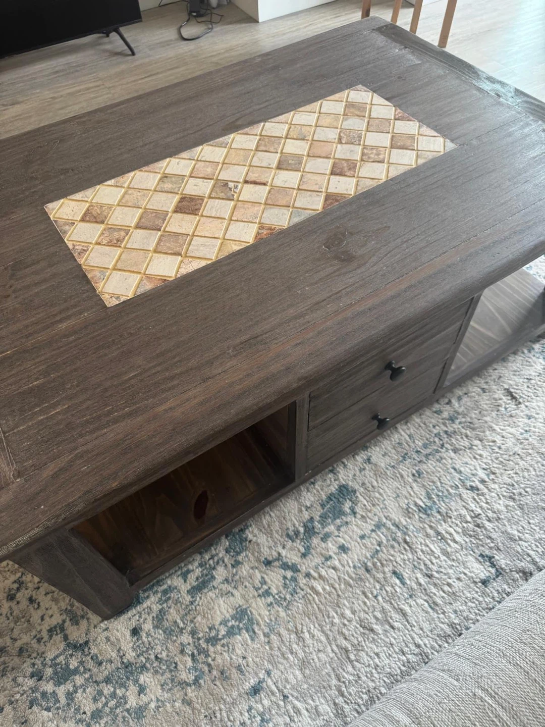 A dark wood coffee table featuring a decorative tiled inlay on the top surface. It includes two drawers for storage and an open shelf below. This table would be great for a living room or family room!