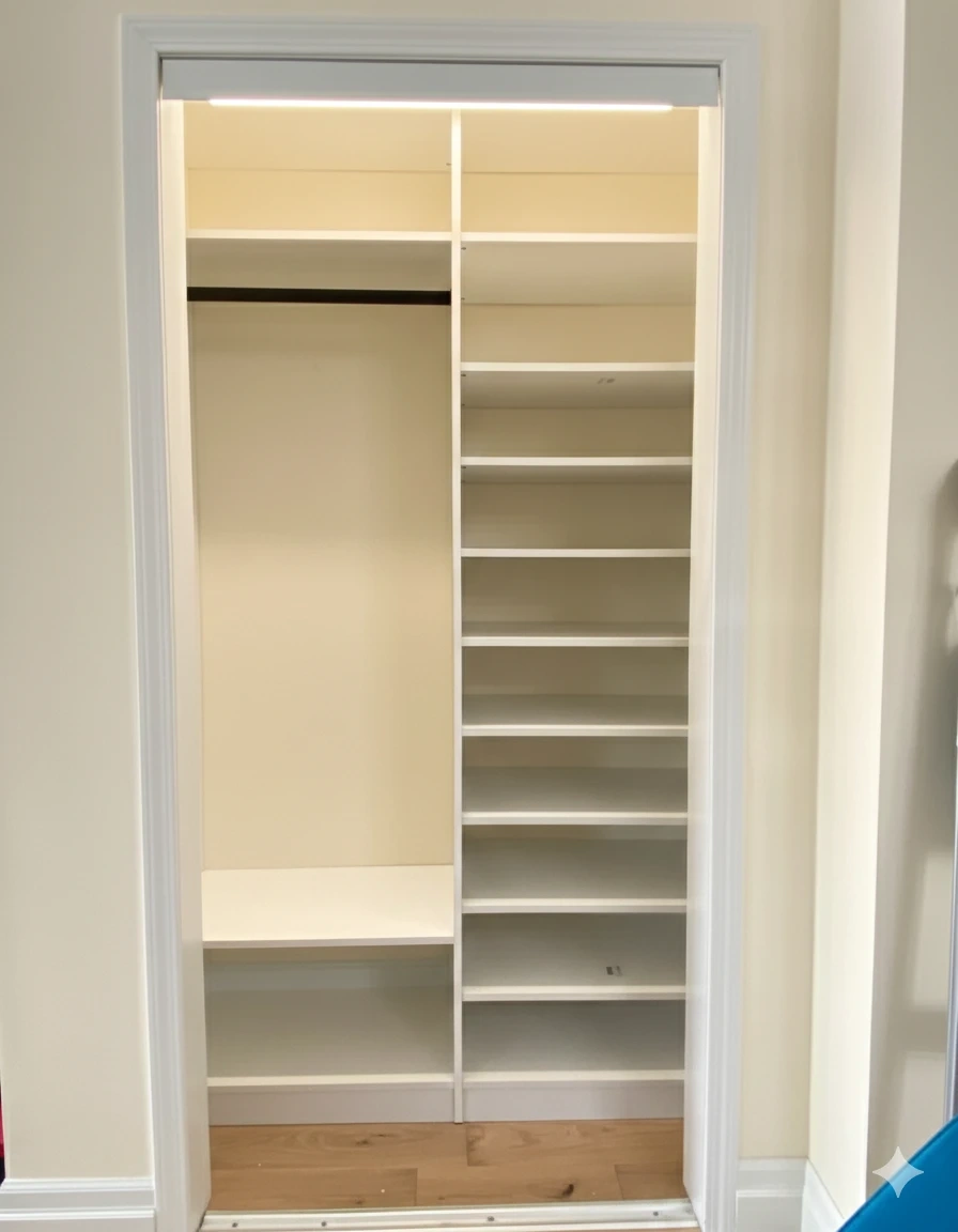 This closet system offers ample storage with multiple shelves and drawers. It's designed to maximize space and keep your belongings tidy. Perfect for organizing clothes, accessories, and more!