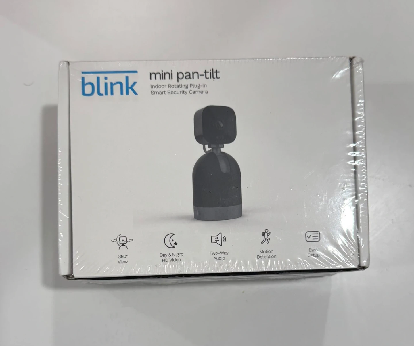 This is a Blink Mini Pan-Tilt indoor rotating plug-in smart security camera. It offers a 360° view with Day & Night HD video. Features two-way audio and motion detection for easy setup. Use it to see, hear, and speak from anywhere!