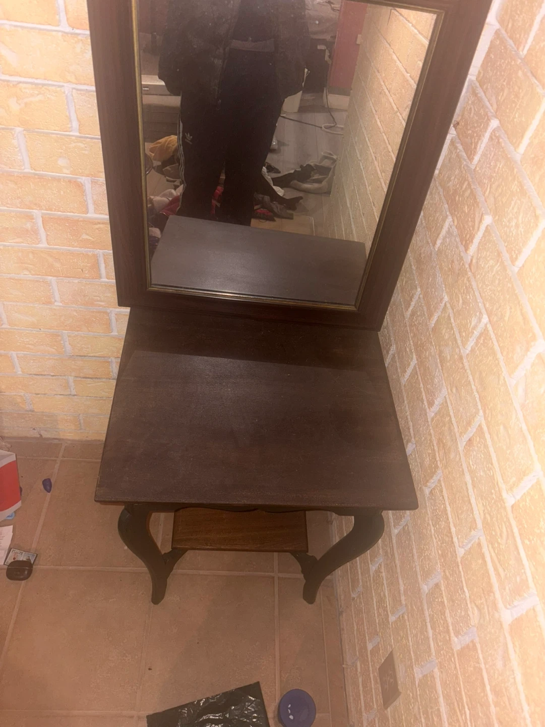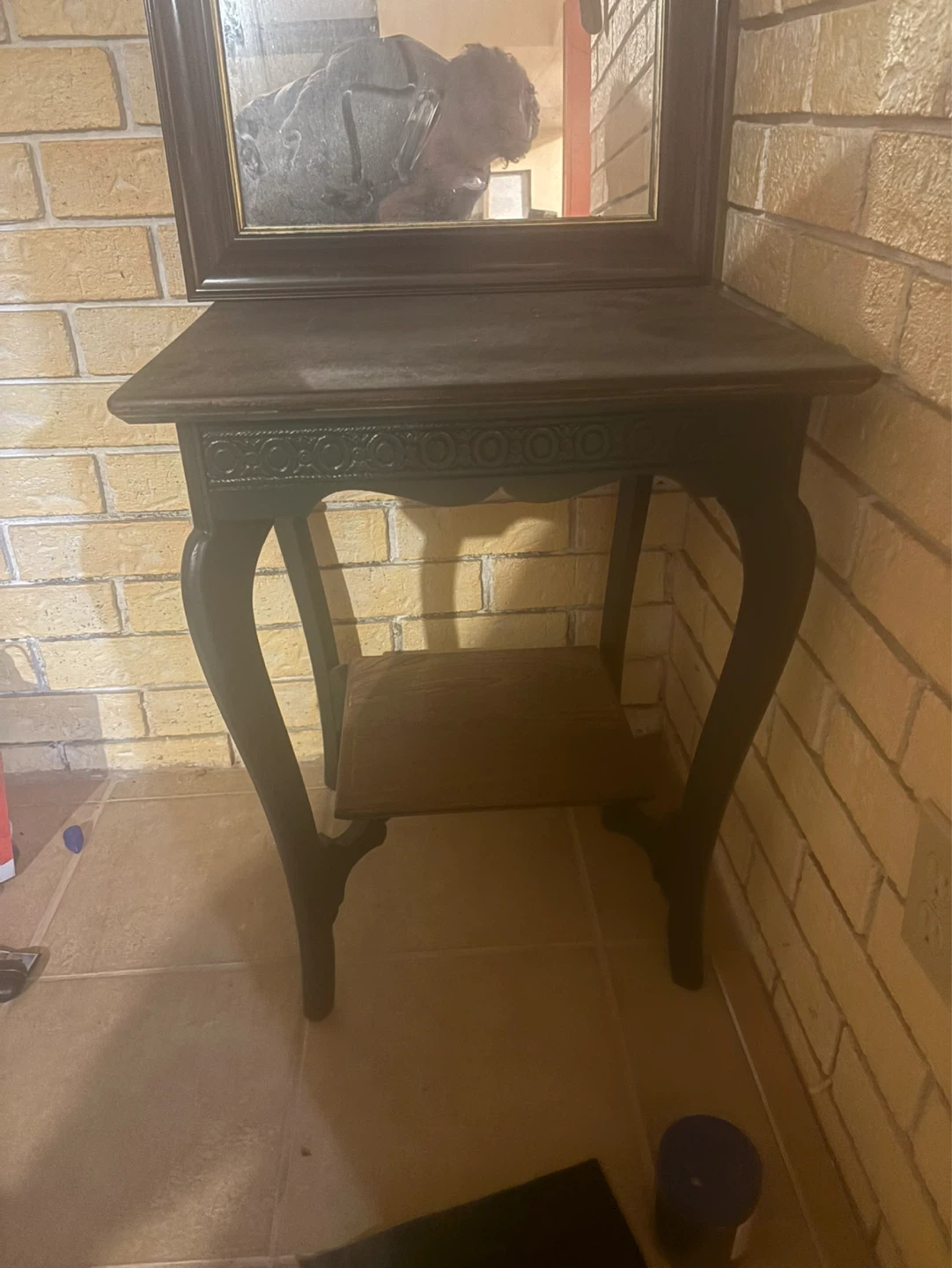 This accent table features a dark green painted finish with a lower shelf for extra storage. It includes a decorative carved edge detail. A matching dark wood framed mirror sits atop the table. Perfect for an entryway or small space!