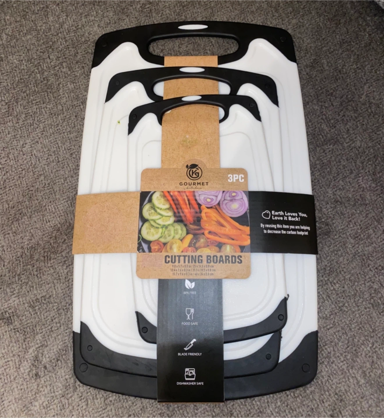 This 3-piece set of cutting boards is BPA-free and food safe. It features juice grooves to collect liquids and a slip-resistant bottom. The boards are also reversible and dishwasher safe.