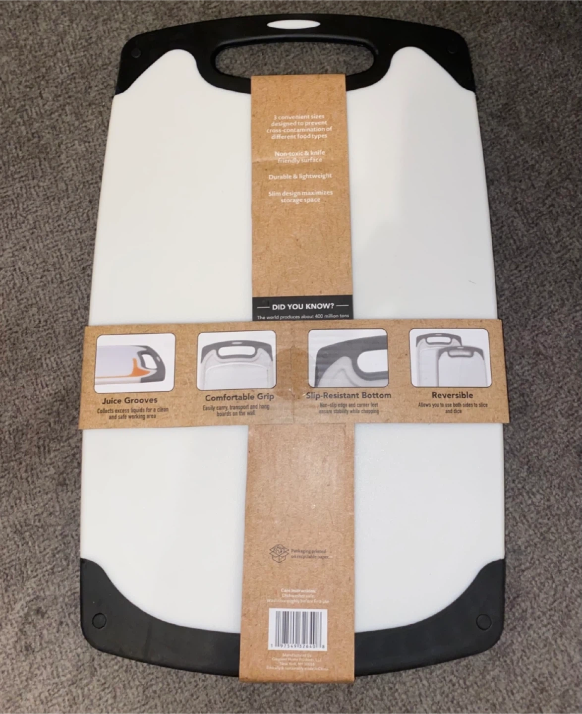 This 3-piece set of cutting boards is BPA-free and food safe. It features juice grooves to collect liquids and a slip-resistant bottom. The boards are also reversible and dishwasher safe.