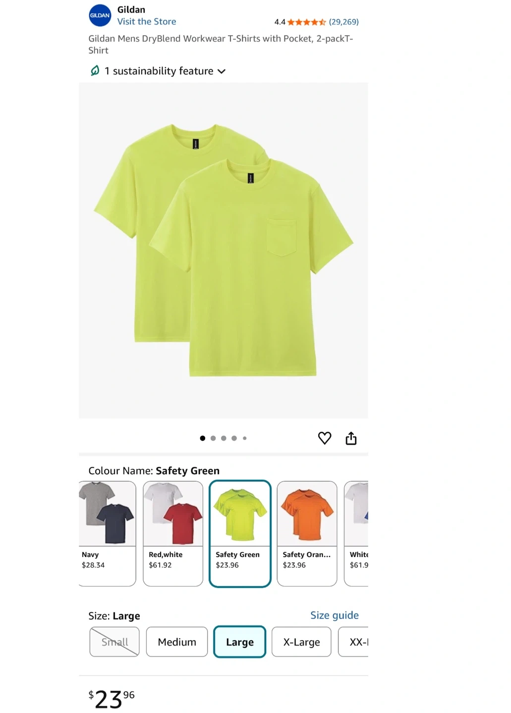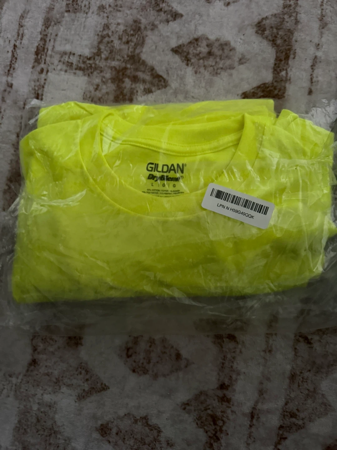 Two Gildan Men's DryBlend t-shirts in Safety Green. Size Large. These shirts are made with a cotton/polyester blend. Comes in a 2-pack.