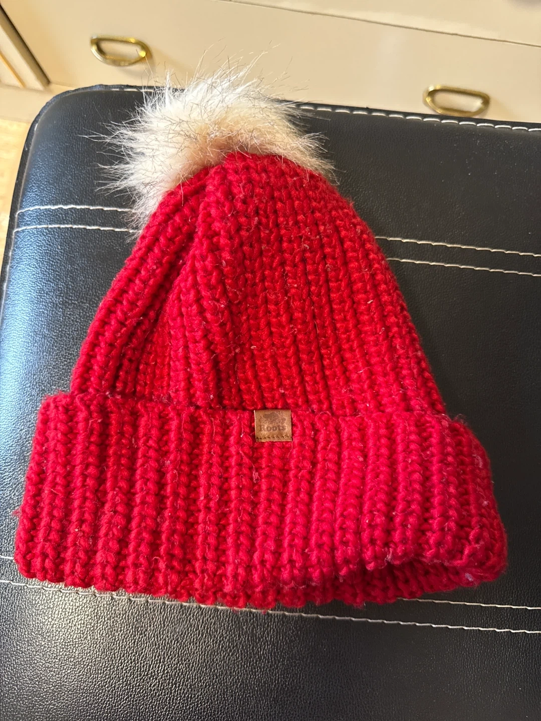 Warm red knit toque with a fluffy pom pom on top. Features a ribbed cuff and a small leather Roots logo patch. It's great for staying cozy on chilly days!