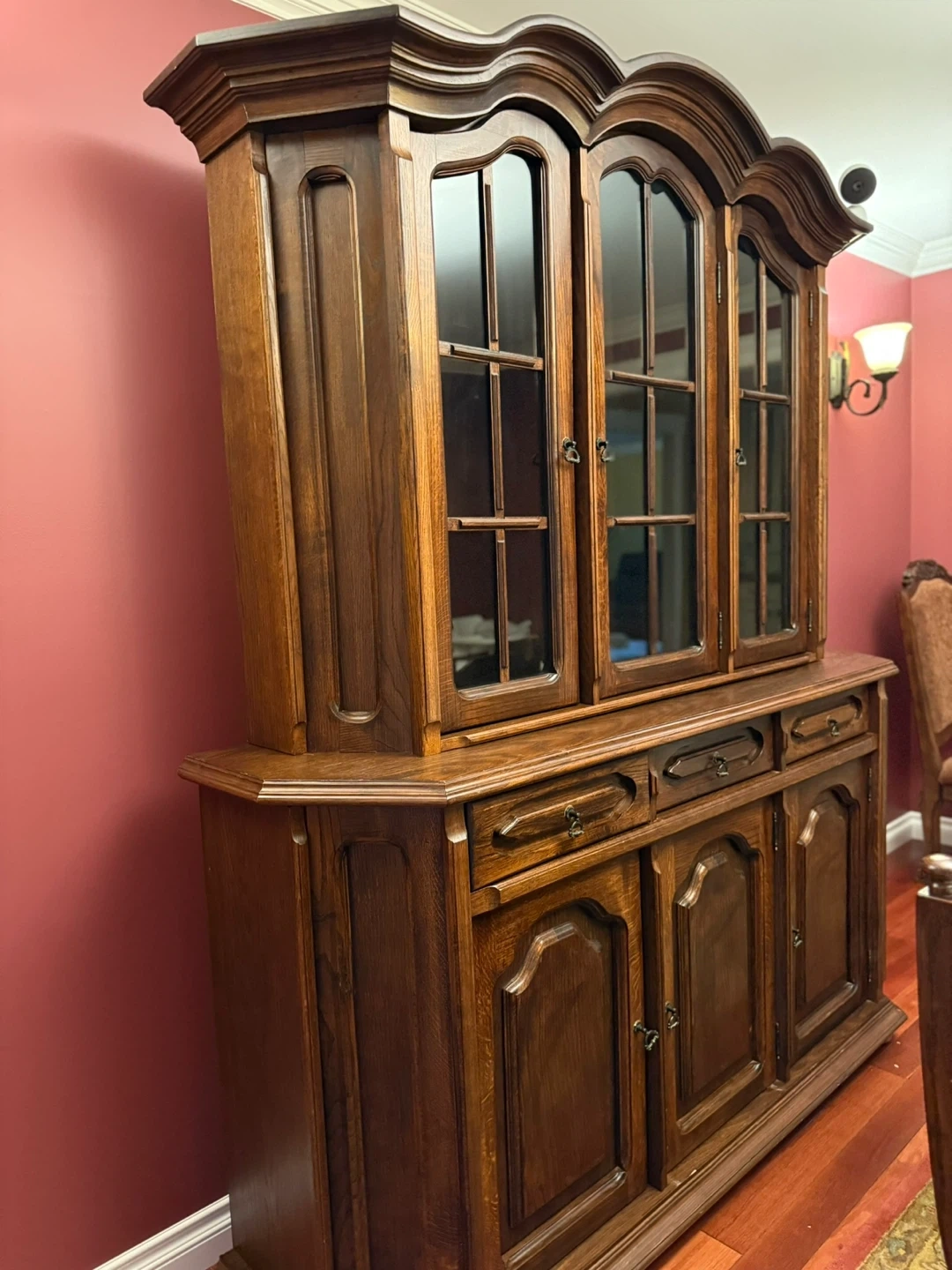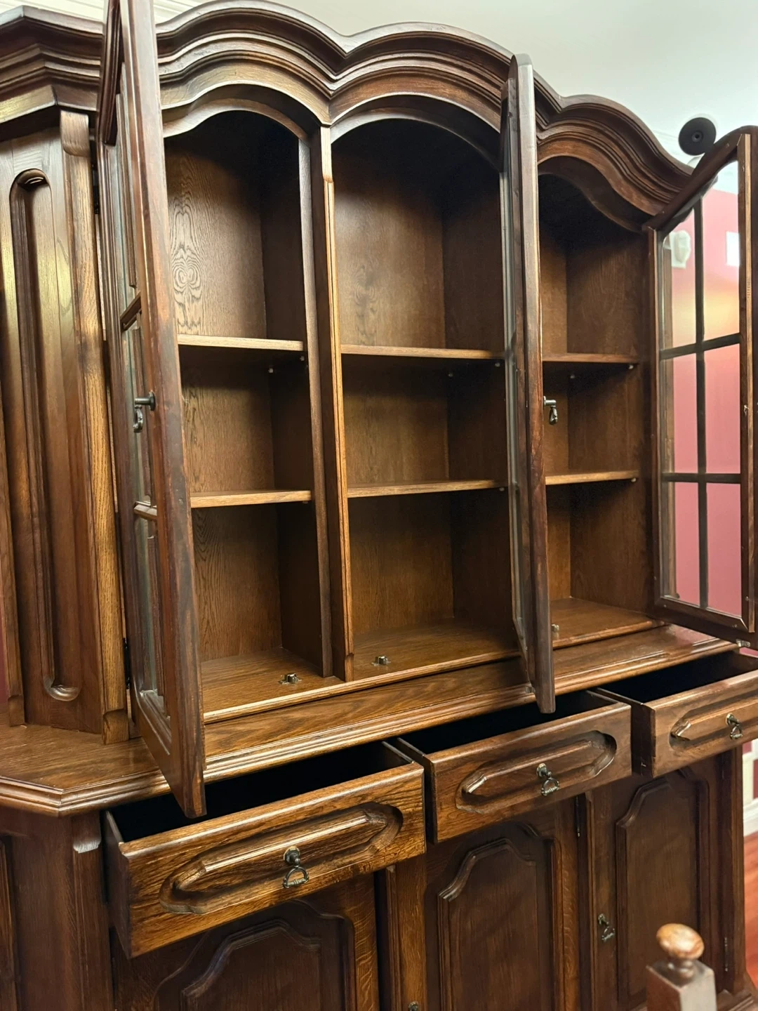 Beautiful solid oak china cabinet and buffet. Features glass doors on the hutch with interior shelving and three drawers. Giving away the top only (not the base so you would need a base to set it on top of). Made with quality solid wood.