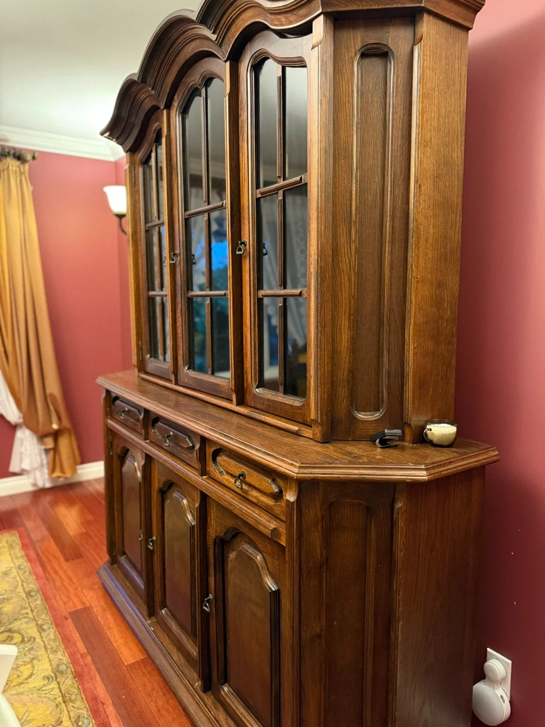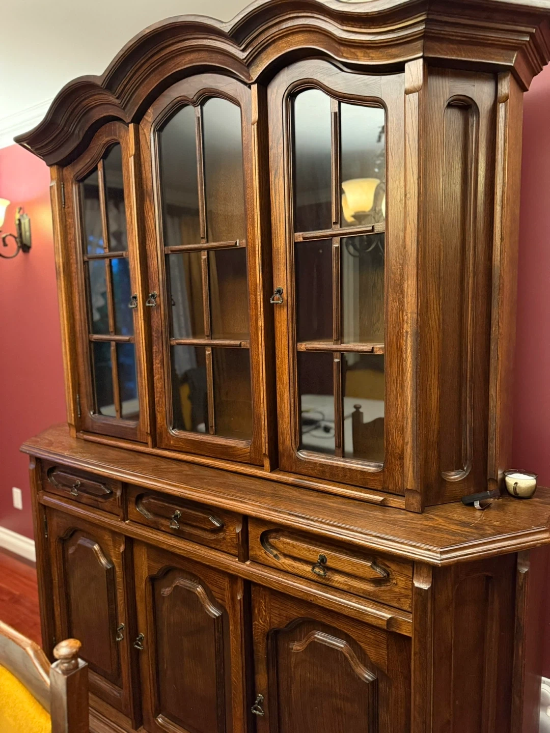 Beautiful solid oak china cabinet and buffet. Features glass doors on the hutch with interior shelving and three drawers. Giving away the top only (not the base so you would need a base to set it on top of). Made with quality solid wood.