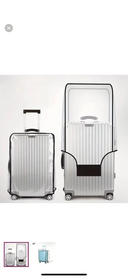 Never used. This transparent cover protects your luggage from dirt and scratches when going through air travel! Has a large velcro closure underneath. Fit for a 26 inch suitcase. Unbranded. Located in Pond Mills. Porch pickup preferred.