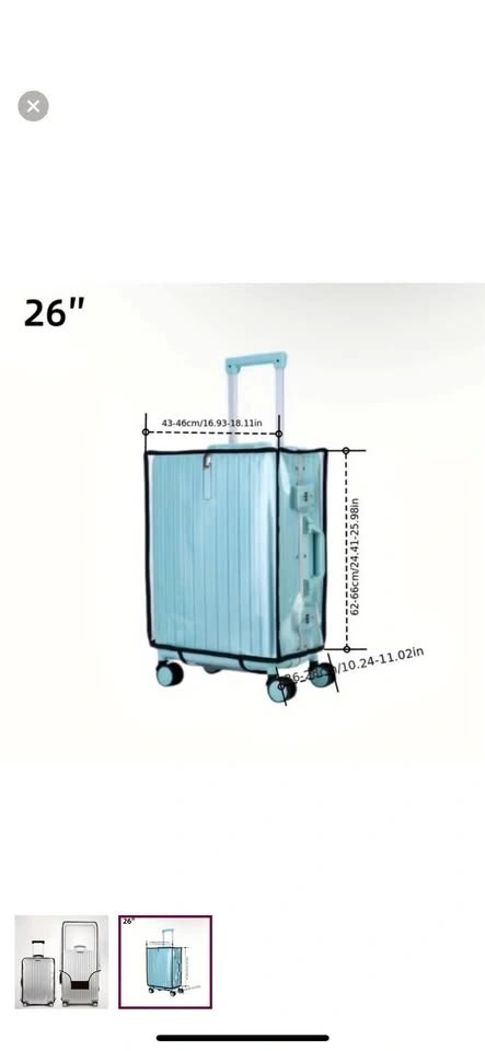 Never used. This transparent cover protects your luggage from dirt and scratches when going through air travel! Has a large velcro closure underneath. Fit for a 26 inch suitcase. Unbranded. Located in Pond Mills. Porch pickup preferred.