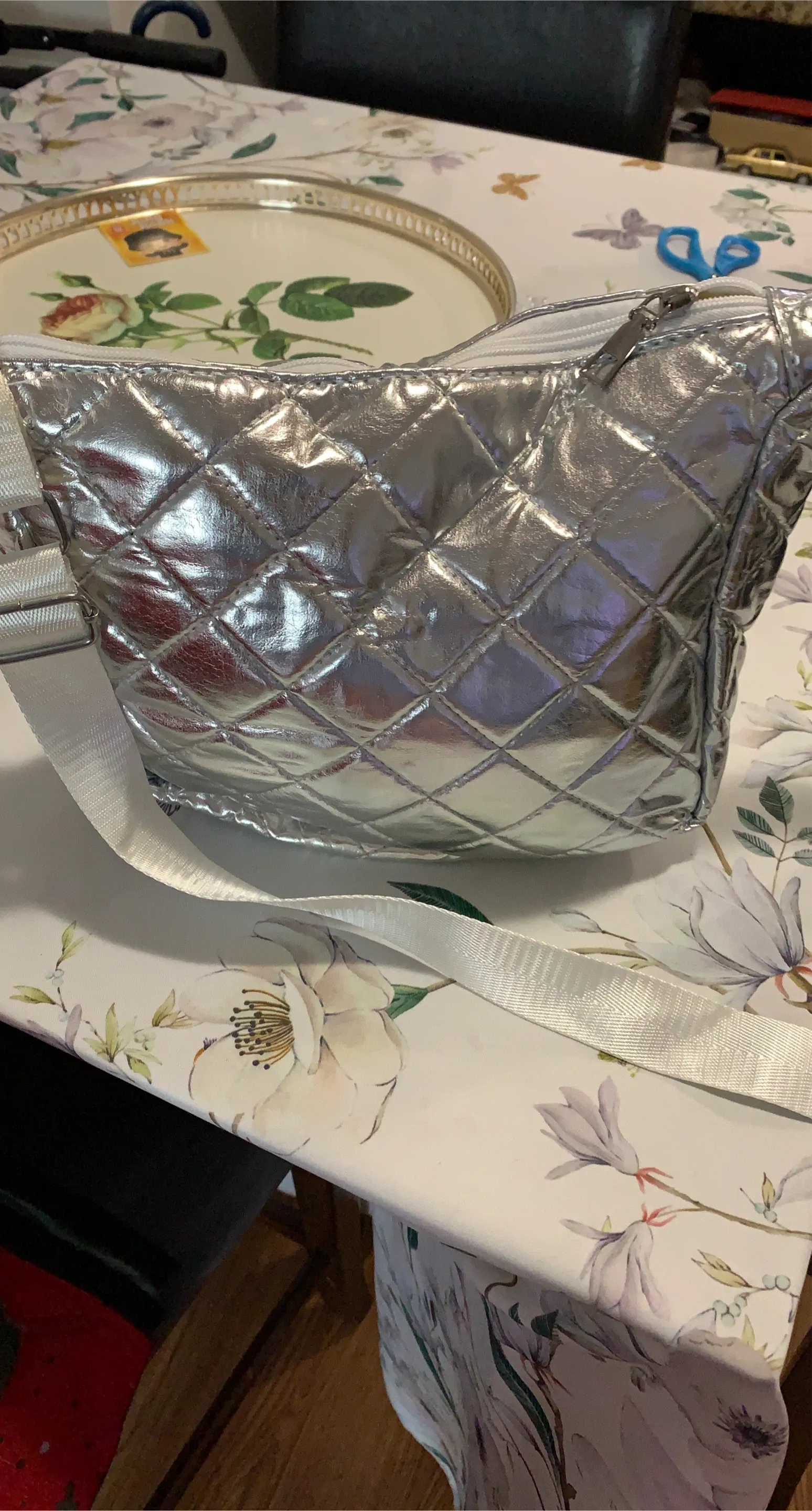 Shiny quilted silver crossbody bag. It's a stylish accessory with a zippered closure. Perfect for carrying essentials on the go!
