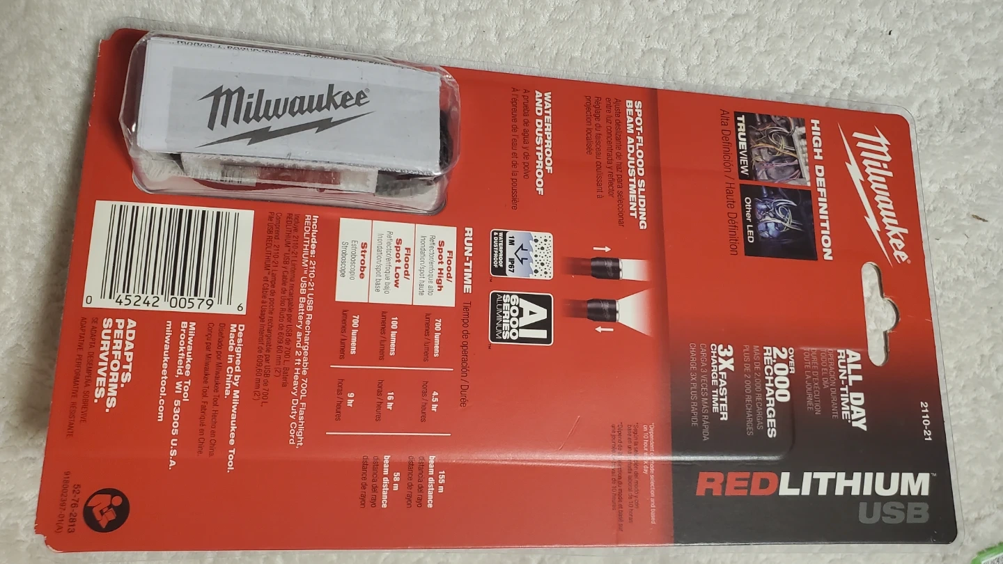 This Milwaukee flashlight comes with REDLITHIUM USB battery technology for 2000 recharges. It offers 700 lumens and a beam distance of 150 meters. The flashlight is spot/flood capable and includes a USB charging cable.
