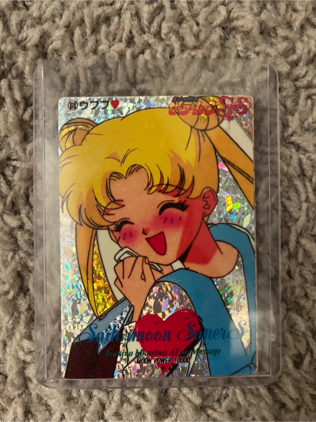 This is a trading card featuring Sailor Moon from the Super S series. It has a holographic glitter finish and displays "Tsukino Hikari Ai No Message" and "MOON POWER 10000".