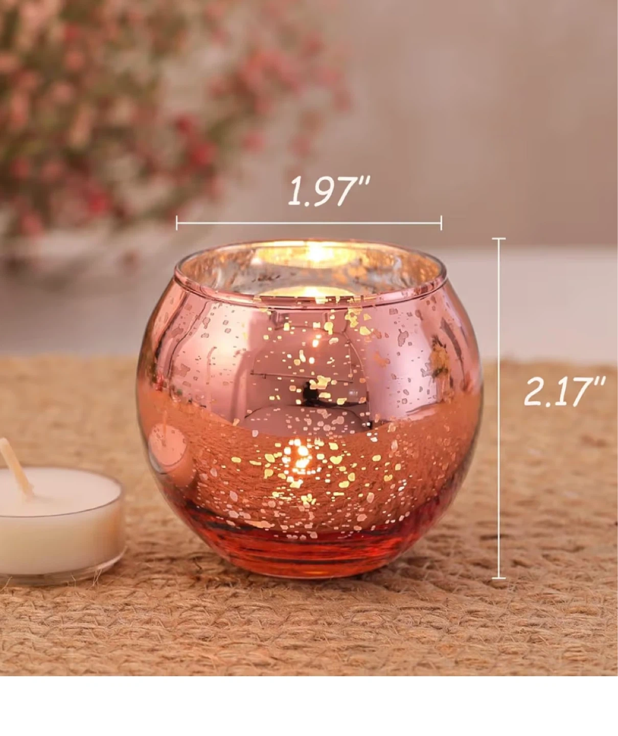 These beautiful votive candle holders have a rose gold mercury glass finish. They're perfect for adding a touch of elegance to any occasion. Dimensions: 1.97" opening diameter, 2.17" height. Includes 12 holders.