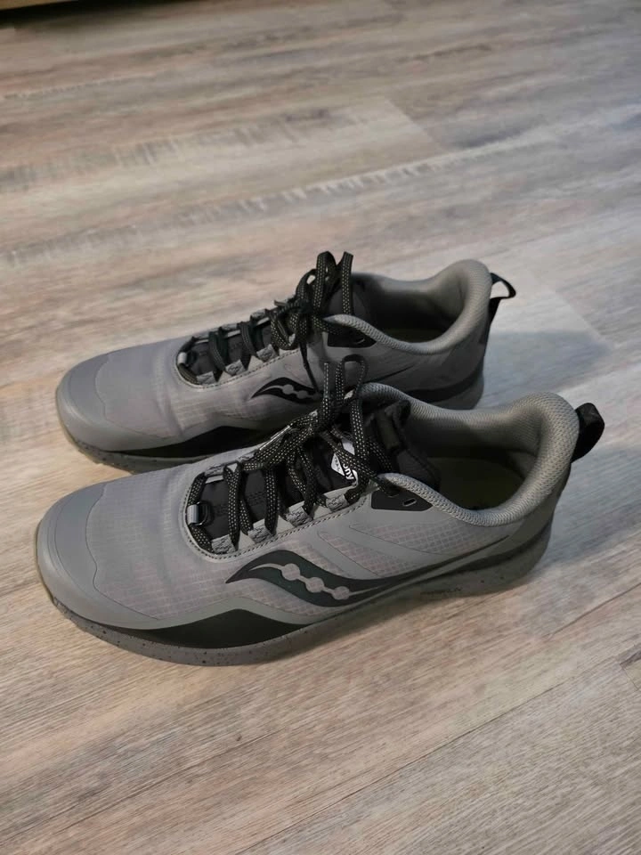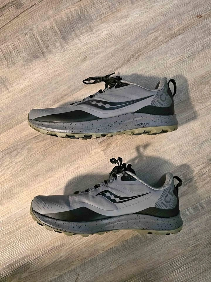 Selling a pair of Saucony Peregrine ICE+ sneakers, specifically designed for winter running. These feature a specialized outsole for grip on wet ice and cold weather conditions. I bought these for snow running but only used them twice. Size: 11 US. Color: Grey/Black with speckled midsole. Technology: Features PWRRUN cushioning for a responsive feel on rugged terrain. Condition: Near perfect. The uppers and tread show almost no wear.