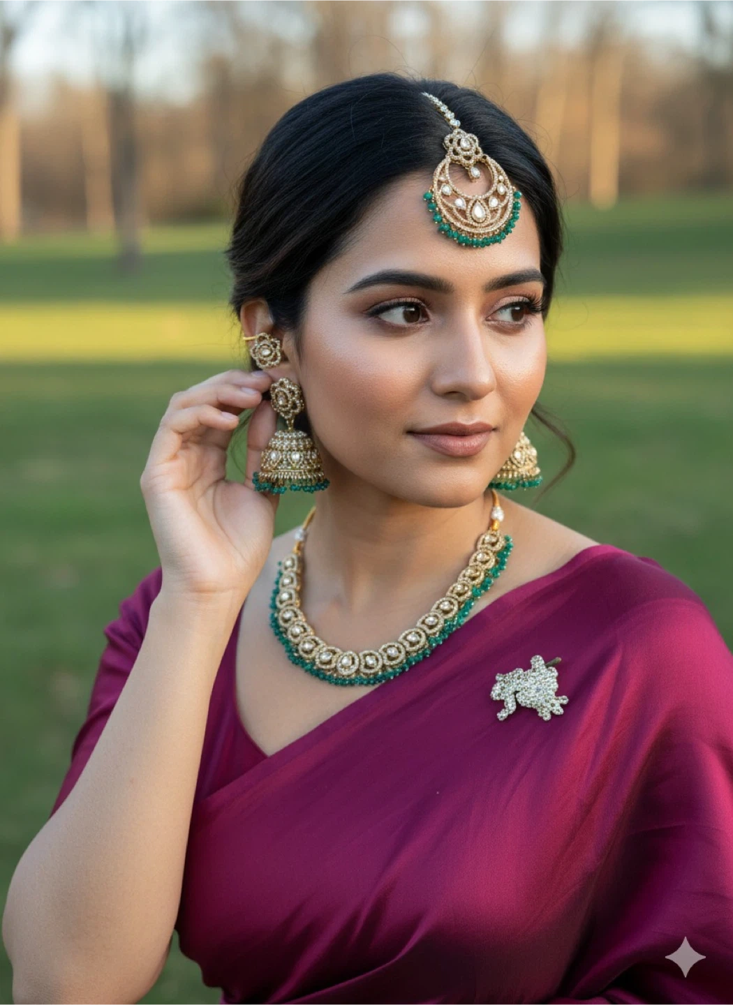 A beautiful gold-tone necklace and jhumka earrings set. It features intricate detailing with vibrant green stones. This set is perfect for special occasions or traditional wear.