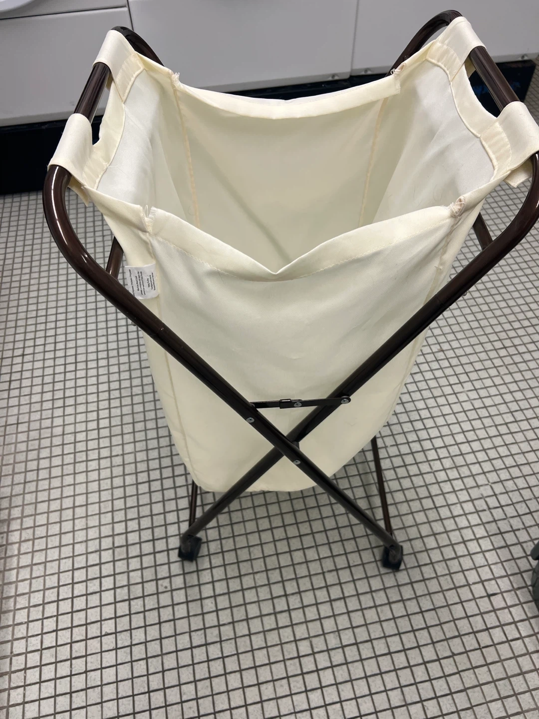 This is a Household Essentials collapsible laundry hamper. It's made of 100% polyester fabric with a metal frame. Machine wash cold and hang to dry.