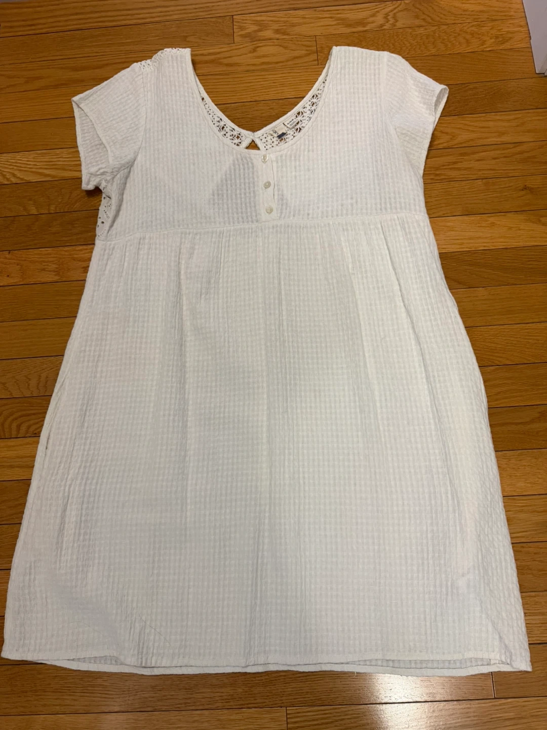 Off white dress with side pockets & lace back with “hole” in center. So cute for that beach getaway!