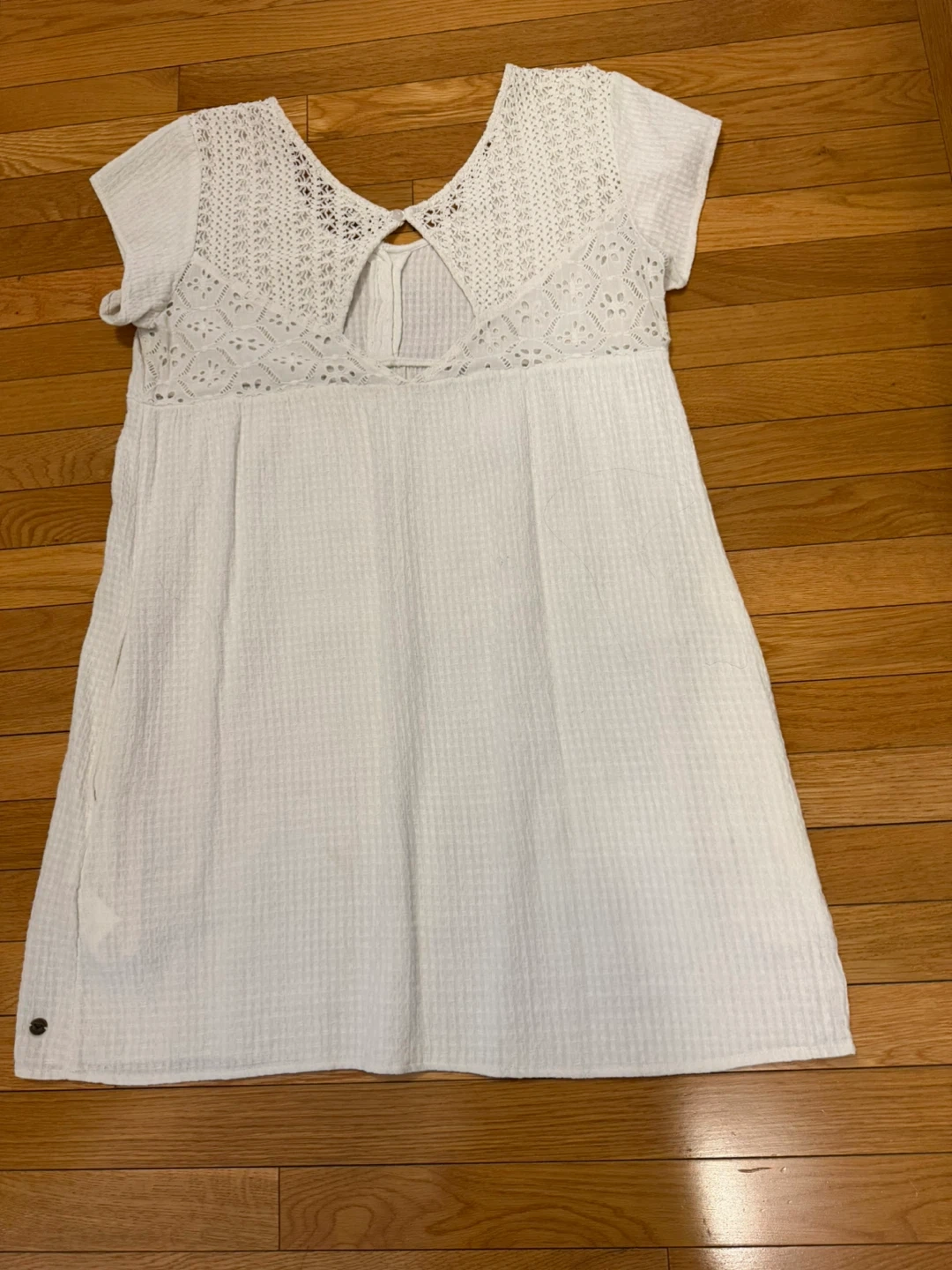 Off white dress with side pockets & lace back with “hole” in center. So cute for that beach getaway!