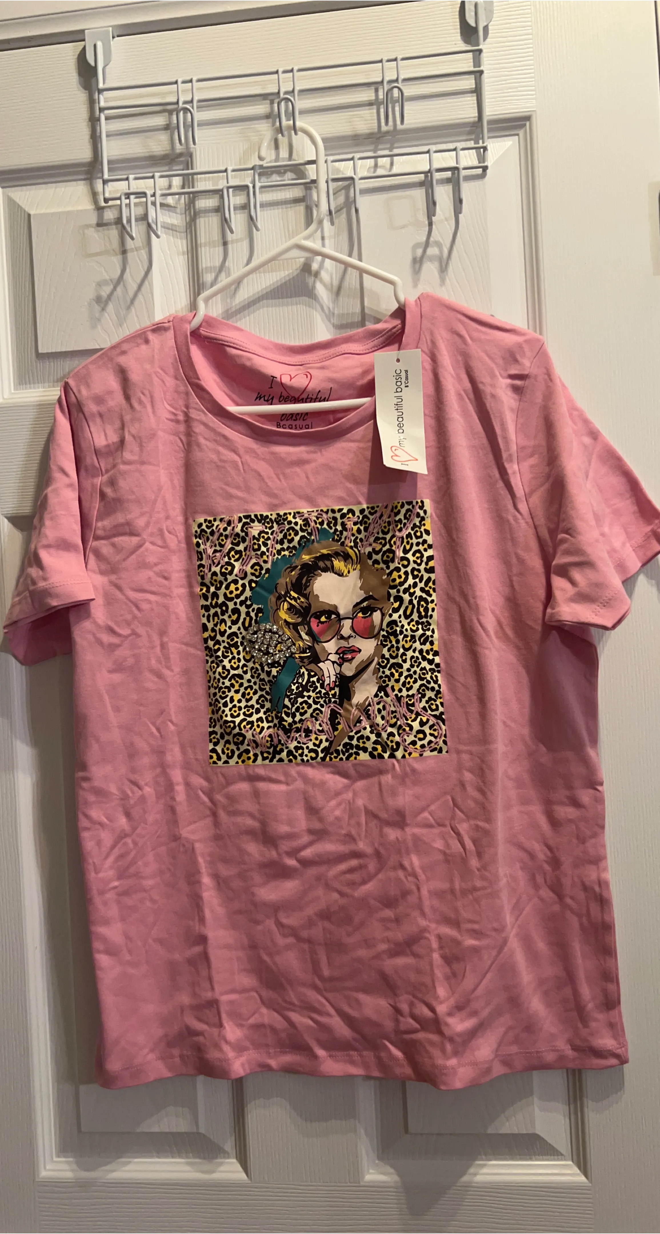 This pink t-shirt has a fun graphic print featuring a stylized woman with leopard print and sunglasses. It's from the "Beautiful Basic Casual" line. The material is soft and comfortable. It's great for casual wear!
