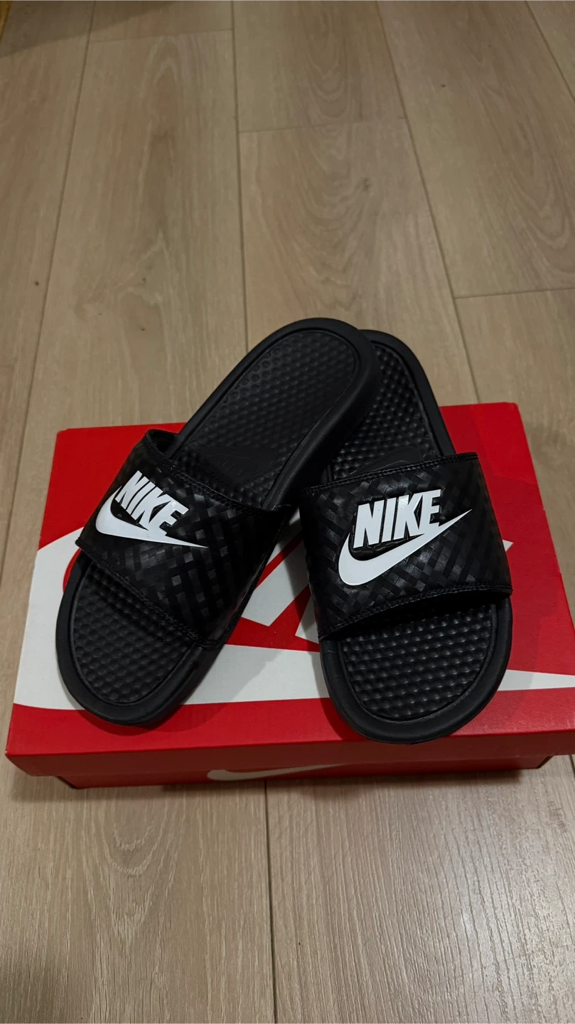 Classic Nike Benassi JDI slides in black with white logos. These slides are comfortable and easy to wear. Perfect for lounging or post-workout. Includes original box.
